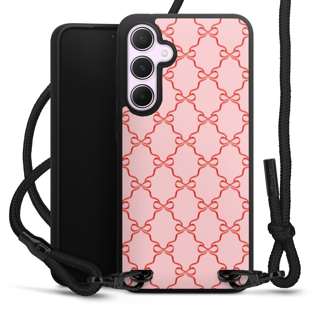 The matt black silicone case is made of flexible TPU (thermoplastic polyurethane) and offers robust protection. The durable, unbreakable material makes the cover flexible and dimensionally stable at the same time. The matte surface makes your design stand out more and is less susceptible to fingerprints and dirt. The stylish trend accessory fits comfortably in the hand and is perfectly complemented by the fabric (polyester) mobile phone strap. The braided fabric strap is approx. 1.70 metres long with a diameter of approx. 0.5 cm. Due to the special knotting technique, the length of the strap can be adjusted by simply pulling it, so that you can adapt it individually to your wishes. The practical case to wear around your neck is available with the fabric strap in black. As a little icing on the cake, we have provided the strap with a chic metal fastener in matt black. The strap is securely fastened to the case with loops made of high-quality genuine leather and press studs. The ends of the fabric strap are covered with metallic end caps and thus protected from fraying.