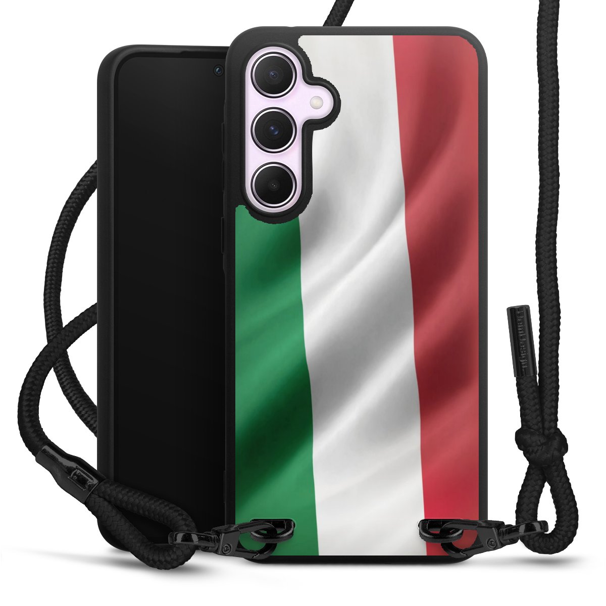 The matt black silicone case is made of flexible TPU (thermoplastic polyurethane) and offers robust protection. The durable, unbreakable material makes the cover flexible and dimensionally stable at the same time. The matte surface makes your design stand out more and is less susceptible to fingerprints and dirt. The stylish trend accessory fits comfortably in the hand and is perfectly complemented by the fabric (polyester) mobile phone strap. The braided fabric strap is approx. 1.70 metres long with a diameter of approx. 0.5 cm. Due to the special knotting technique, the length of the strap can be adjusted by simply pulling it, so that you can adapt it individually to your wishes. The practical case to wear around your neck is available with the fabric strap in black. As a little icing on the cake, we have provided the strap with a chic metal fastener in matt black. The strap is securely fastened to the case with loops made of high-quality genuine leather and press studs. The ends of the fabric strap are covered with metallic end caps and thus protected from fraying.