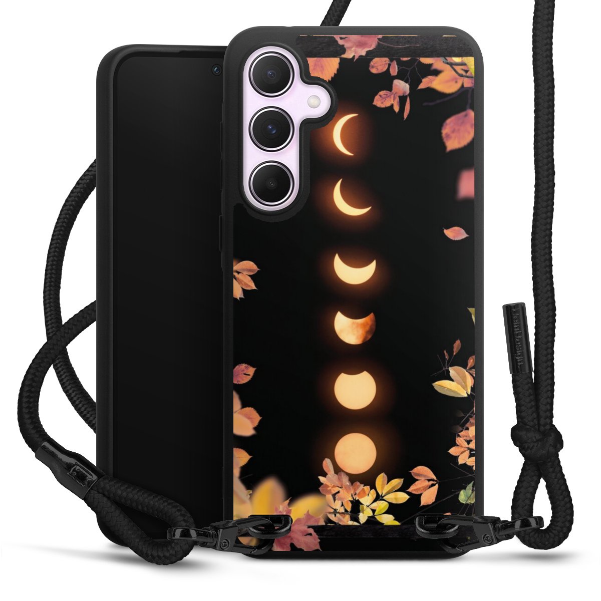 The matt black silicone case is made of flexible TPU (thermoplastic polyurethane) and offers robust protection. The durable, unbreakable material makes the cover flexible and dimensionally stable at the same time. The matte surface makes your design stand out more and is less susceptible to fingerprints and dirt. The stylish trend accessory fits comfortably in the hand and is perfectly complemented by the fabric (polyester) mobile phone strap. The braided fabric strap is approx. 1.70 metres long with a diameter of approx. 0.5 cm. Due to the special knotting technique, the length of the strap can be adjusted by simply pulling it, so that you can adapt it individually to your wishes. The practical case to wear around your neck is available with the fabric strap in black. As a little icing on the cake, we have provided the strap with a chic metal fastener in matt black. The strap is securely fastened to the case with loops made of high-quality genuine leather and press studs. The ends of the fabric strap are covered with metallic end caps and thus protected from fraying.