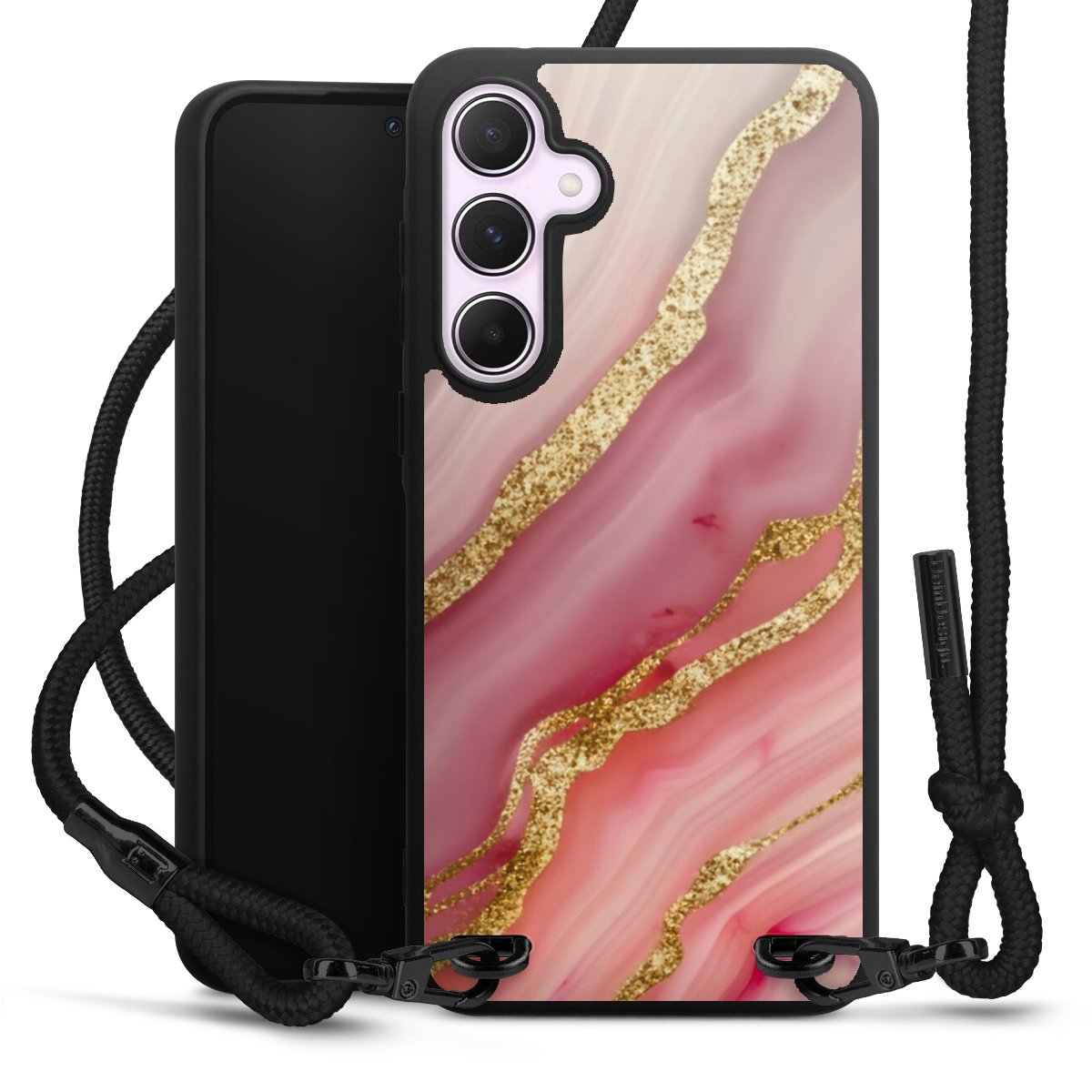 The matt black silicone case is made of flexible TPU (thermoplastic polyurethane) and offers robust protection. The durable, unbreakable material makes the cover flexible and dimensionally stable at the same time. The matte surface makes your design stand out more and is less susceptible to fingerprints and dirt. The stylish trend accessory fits comfortably in the hand and is perfectly complemented by the fabric (polyester) mobile phone strap. The braided fabric strap is approx. 1.70 metres long with a diameter of approx. 0.5 cm. Due to the special knotting technique, the length of the strap can be adjusted by simply pulling it, so that you can adapt it individually to your wishes. The practical case to wear around your neck is available with the fabric strap in black. As a little icing on the cake, we have provided the strap with a chic metal fastener in matt black. The strap is securely fastened to the case with loops made of high-quality genuine leather and press studs. The ends of the fabric strap are covered with metallic end caps and thus protected from fraying.
