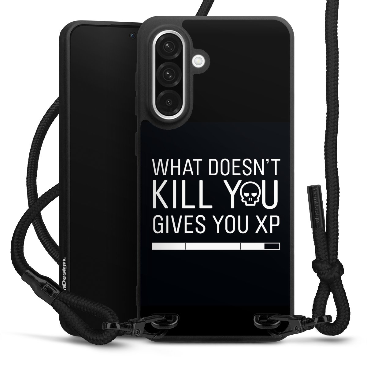 The matt black silicone case is made of flexible TPU (thermoplastic polyurethane) and offers robust protection. The durable, unbreakable material makes the cover flexible and dimensionally stable at the same time. The matte surface makes your design stand out more and is less susceptible to fingerprints and dirt. The stylish trend accessory fits comfortably in the hand and is perfectly complemented by the fabric (polyester) mobile phone strap. The braided fabric strap is approx. 1.70 metres long with a diameter of approx. 0.5 cm. Due to the special knotting technique, the length of the strap can be adjusted by simply pulling it, so that you can adapt it individually to your wishes. The practical case to wear around your neck is available with the fabric strap in black. As a little icing on the cake, we have provided the strap with a chic metal fastener in matt black. The strap is securely fastened to the case with loops made of high-quality genuine leather and press studs. The ends of the fabric strap are covered with metallic end caps and thus protected from fraying.