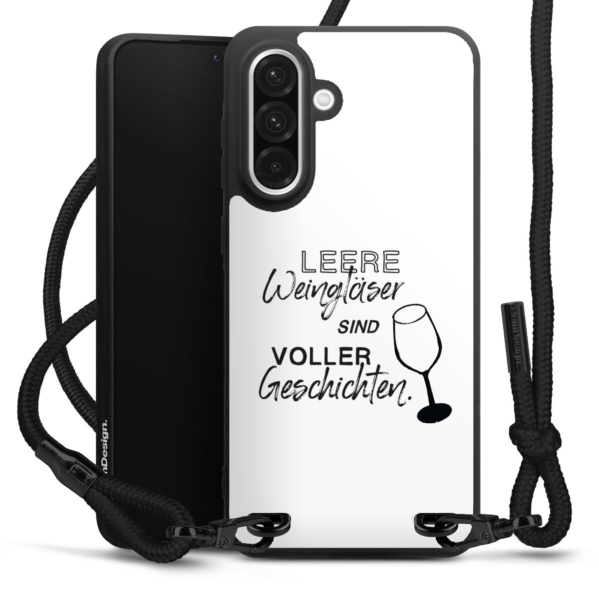 The matt black silicone case is made of flexible TPU (thermoplastic polyurethane) and offers robust protection. The durable, unbreakable material makes the cover flexible and dimensionally stable at the same time. The matte surface makes your design stand out more and is less susceptible to fingerprints and dirt. The stylish trend accessory fits comfortably in the hand and is perfectly complemented by the fabric (polyester) mobile phone strap. The braided fabric strap is approx. 1.70 metres long with a diameter of approx. 0.5 cm. Due to the special knotting technique, the length of the strap can be adjusted by simply pulling it, so that you can adapt it individually to your wishes. The practical case to wear around your neck is available with the fabric strap in black. As a little icing on the cake, we have provided the strap with a chic metal fastener in matt black. The strap is securely fastened to the case with loops made of high-quality genuine leather and press studs. The ends of the fabric strap are covered with metallic end caps and thus protected from fraying.