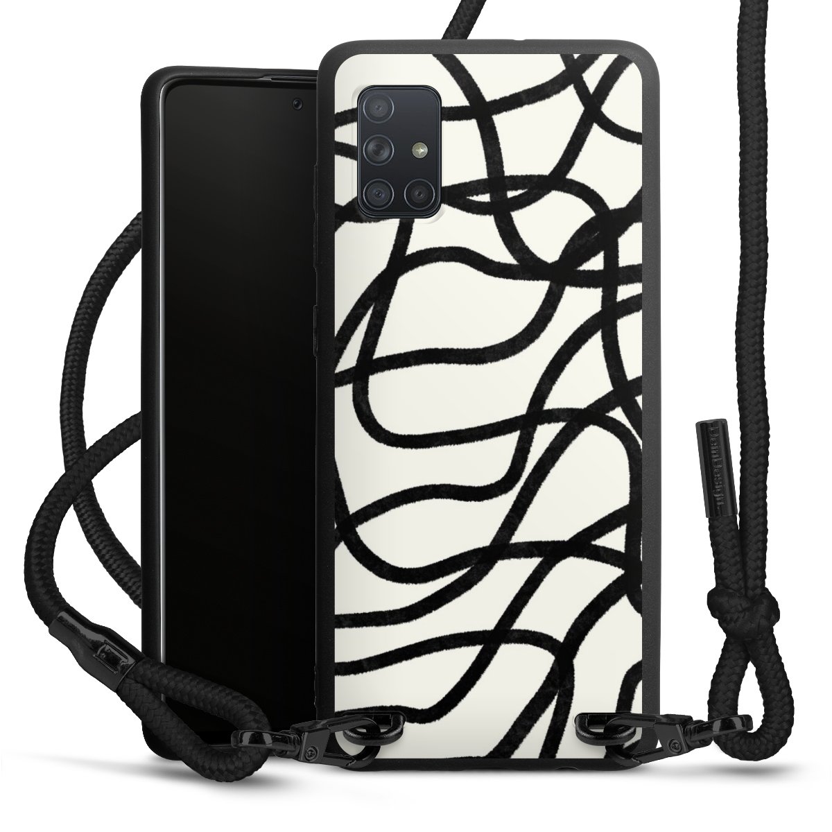 The matt black silicone case is made of flexible TPU (thermoplastic polyurethane) and offers robust protection. The durable, unbreakable material makes the cover flexible and dimensionally stable at the same time. The matte surface makes your design stand out more and is less susceptible to fingerprints and dirt. The stylish trend accessory fits comfortably in the hand and is perfectly complemented by the fabric (polyester) mobile phone strap. The braided fabric strap is approx. 1.70 metres long with a diameter of approx. 0.5 cm. Due to the special knotting technique, the length of the strap can be adjusted by simply pulling it, so that you can adapt it individually to your wishes. The practical case to wear around your neck is available with the fabric strap in black. As a little icing on the cake, we have provided the strap with a chic metal fastener in matt black. The strap is securely fastened to the case with loops made of high-quality genuine leather and press studs. The ends of the fabric strap are covered with metallic end caps and thus protected from fraying.