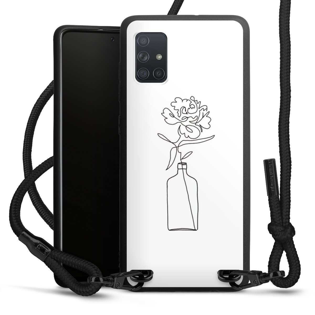 The matt black silicone case is made of flexible TPU (thermoplastic polyurethane) and offers robust protection. The durable, unbreakable material makes the cover flexible and dimensionally stable at the same time. The matte surface makes your design stand out more and is less susceptible to fingerprints and dirt. The stylish trend accessory fits comfortably in the hand and is perfectly complemented by the fabric (polyester) mobile phone strap. The braided fabric strap is approx. 1.70 metres long with a diameter of approx. 0.5 cm. Due to the special knotting technique, the length of the strap can be adjusted by simply pulling it, so that you can adapt it individually to your wishes. The practical case to wear around your neck is available with the fabric strap in black. As a little icing on the cake, we have provided the strap with a chic metal fastener in matt black. The strap is securely fastened to the case with loops made of high-quality genuine leather and press studs. The ends of the fabric strap are covered with metallic end caps and thus protected from fraying.