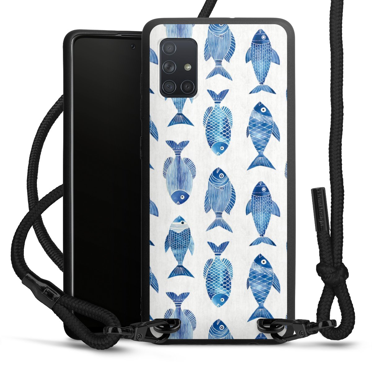 The matt black silicone case is made of flexible TPU (thermoplastic polyurethane) and offers robust protection. The durable, unbreakable material makes the cover flexible and dimensionally stable at the same time. The matte surface makes your design stand out more and is less susceptible to fingerprints and dirt. The stylish trend accessory fits comfortably in the hand and is perfectly complemented by the fabric (polyester) mobile phone strap. The braided fabric strap is approx. 1.70 metres long with a diameter of approx. 0.5 cm. Due to the special knotting technique, the length of the strap can be adjusted by simply pulling it, so that you can adapt it individually to your wishes. The practical case to wear around your neck is available with the fabric strap in black. As a little icing on the cake, we have provided the strap with a chic metal fastener in matt black. The strap is securely fastened to the case with loops made of high-quality genuine leather and press studs. The ends of the fabric strap are covered with metallic end caps and thus protected from fraying.