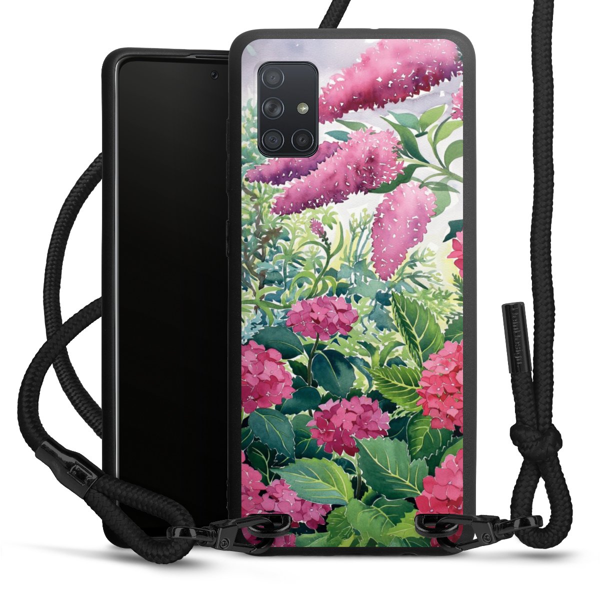 The matt black silicone case is made of flexible TPU (thermoplastic polyurethane) and offers robust protection. The durable, unbreakable material makes the cover flexible and dimensionally stable at the same time. The matte surface makes your design stand out more and is less susceptible to fingerprints and dirt. The stylish trend accessory fits comfortably in the hand and is perfectly complemented by the fabric (polyester) mobile phone strap. The braided fabric strap is approx. 1.70 metres long with a diameter of approx. 0.5 cm. Due to the special knotting technique, the length of the strap can be adjusted by simply pulling it, so that you can adapt it individually to your wishes. The practical case to wear around your neck is available with the fabric strap in black. As a little icing on the cake, we have provided the strap with a chic metal fastener in matt black. The strap is securely fastened to the case with loops made of high-quality genuine leather and press studs. The ends of the fabric strap are covered with metallic end caps and thus protected from fraying.