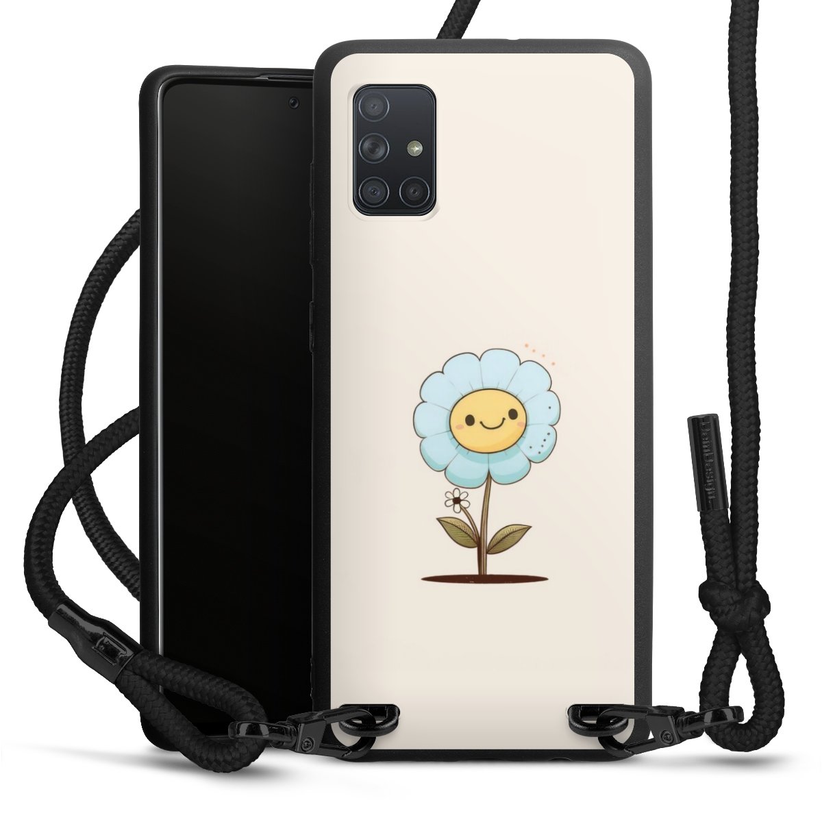 The matt black silicone case is made of flexible TPU (thermoplastic polyurethane) and offers robust protection. The durable, unbreakable material makes the cover flexible and dimensionally stable at the same time. The matte surface makes your design stand out more and is less susceptible to fingerprints and dirt. The stylish trend accessory fits comfortably in the hand and is perfectly complemented by the fabric (polyester) mobile phone strap. The braided fabric strap is approx. 1.70 metres long with a diameter of approx. 0.5 cm. Due to the special knotting technique, the length of the strap can be adjusted by simply pulling it, so that you can adapt it individually to your wishes. The practical case to wear around your neck is available with the fabric strap in black. As a little icing on the cake, we have provided the strap with a chic metal fastener in matt black. The strap is securely fastened to the case with loops made of high-quality genuine leather and press studs. The ends of the fabric strap are covered with metallic end caps and thus protected from fraying.