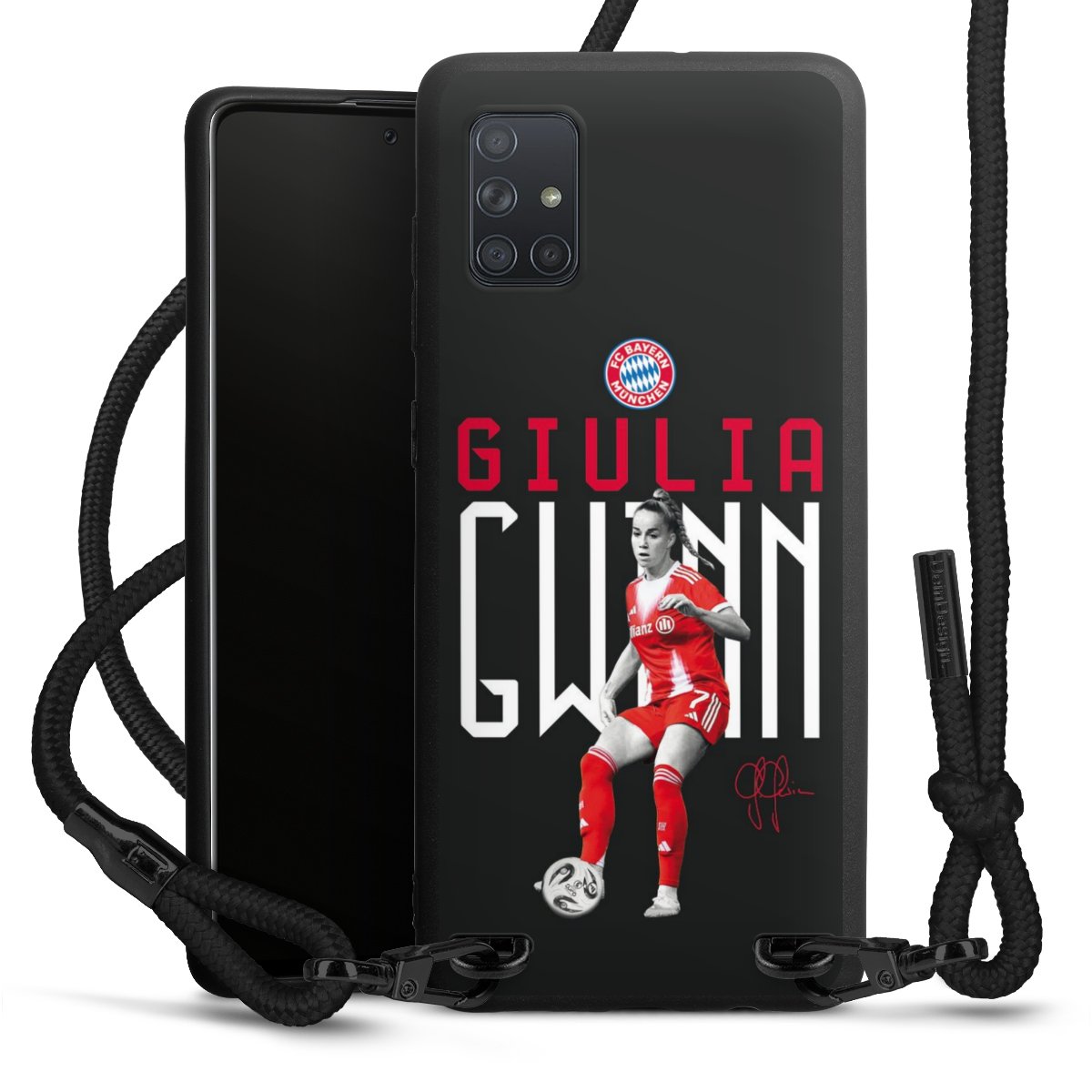 The matt black silicone case is made of flexible TPU (thermoplastic polyurethane) and offers robust protection. The durable, unbreakable material makes the cover flexible and dimensionally stable at the same time. The matte surface makes your design stand out more and is less susceptible to fingerprints and dirt. The stylish trend accessory fits comfortably in the hand and is perfectly complemented by the fabric (polyester) mobile phone strap. The braided fabric strap is approx. 1.70 metres long with a diameter of approx. 0.5 cm. Due to the special knotting technique, the length of the strap can be adjusted by simply pulling it, so that you can adapt it individually to your wishes. The practical case to wear around your neck is available with the fabric strap in black. As a little icing on the cake, we have provided the strap with a chic metal fastener in matt black. The strap is securely fastened to the case with loops made of high-quality genuine leather and press studs. The ends of the fabric strap are covered with metallic end caps and thus protected from fraying.