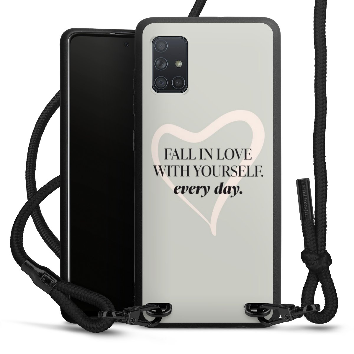 The matt black silicone case is made of flexible TPU (thermoplastic polyurethane) and offers robust protection. The durable, unbreakable material makes the cover flexible and dimensionally stable at the same time. The matte surface makes your design stand out more and is less susceptible to fingerprints and dirt. The stylish trend accessory fits comfortably in the hand and is perfectly complemented by the fabric (polyester) mobile phone strap. The braided fabric strap is approx. 1.70 metres long with a diameter of approx. 0.5 cm. Due to the special knotting technique, the length of the strap can be adjusted by simply pulling it, so that you can adapt it individually to your wishes. The practical case to wear around your neck is available with the fabric strap in black. As a little icing on the cake, we have provided the strap with a chic metal fastener in matt black. The strap is securely fastened to the case with loops made of high-quality genuine leather and press studs. The ends of the fabric strap are covered with metallic end caps and thus protected from fraying.