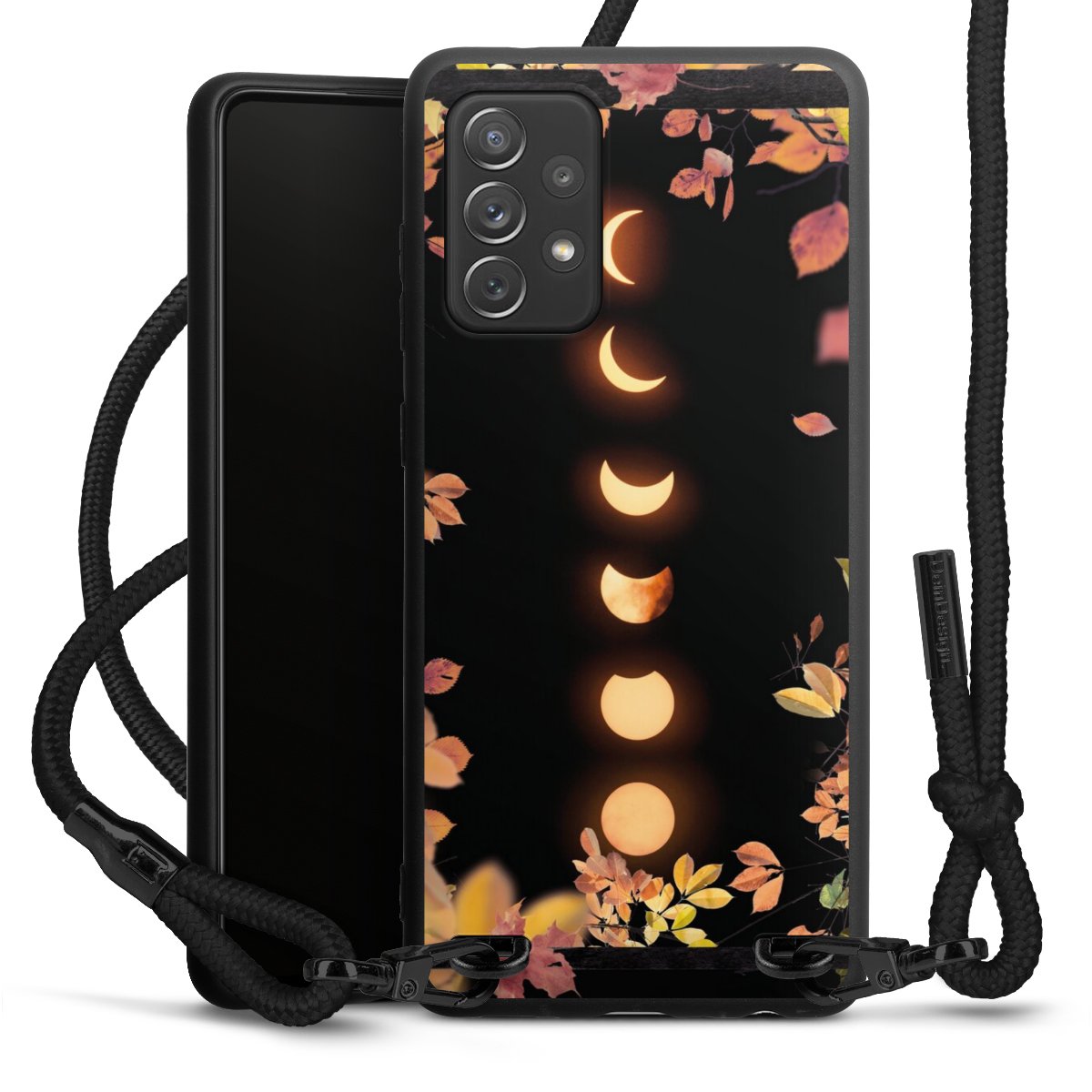 The matt black silicone case is made of flexible TPU (thermoplastic polyurethane) and offers robust protection. The durable, unbreakable material makes the cover flexible and dimensionally stable at the same time. The matte surface makes your design stand out more and is less susceptible to fingerprints and dirt. The stylish trend accessory fits comfortably in the hand and is perfectly complemented by the fabric (polyester) mobile phone strap. The braided fabric strap is approx. 1.70 metres long with a diameter of approx. 0.5 cm. Due to the special knotting technique, the length of the strap can be adjusted by simply pulling it, so that you can adapt it individually to your wishes. The practical case to wear around your neck is available with the fabric strap in black. As a little icing on the cake, we have provided the strap with a chic metal fastener in matt black. The strap is securely fastened to the case with loops made of high-quality genuine leather and press studs. The ends of the fabric strap are covered with metallic end caps and thus protected from fraying.