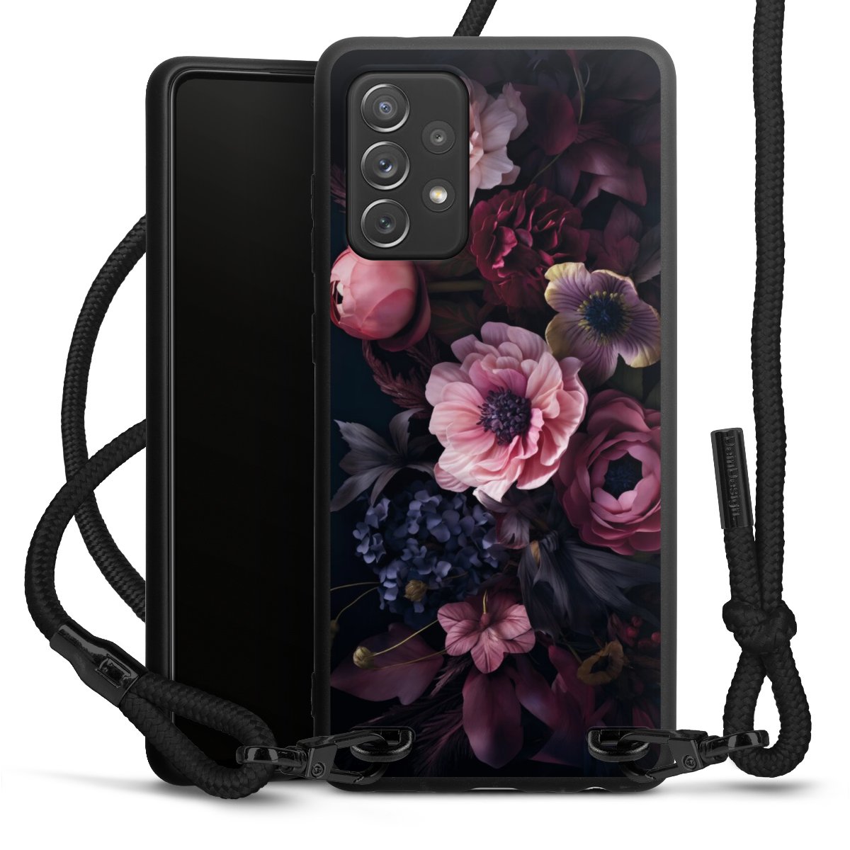 The matt black silicone case is made of flexible TPU (thermoplastic polyurethane) and offers robust protection. The durable, unbreakable material makes the cover flexible and dimensionally stable at the same time. The matte surface makes your design stand out more and is less susceptible to fingerprints and dirt. The stylish trend accessory fits comfortably in the hand and is perfectly complemented by the fabric (polyester) mobile phone strap. The braided fabric strap is approx. 1.70 metres long with a diameter of approx. 0.5 cm. Due to the special knotting technique, the length of the strap can be adjusted by simply pulling it, so that you can adapt it individually to your wishes. The practical case to wear around your neck is available with the fabric strap in black. As a little icing on the cake, we have provided the strap with a chic metal fastener in matt black. The strap is securely fastened to the case with loops made of high-quality genuine leather and press studs. The ends of the fabric strap are covered with metallic end caps and thus protected from fraying.