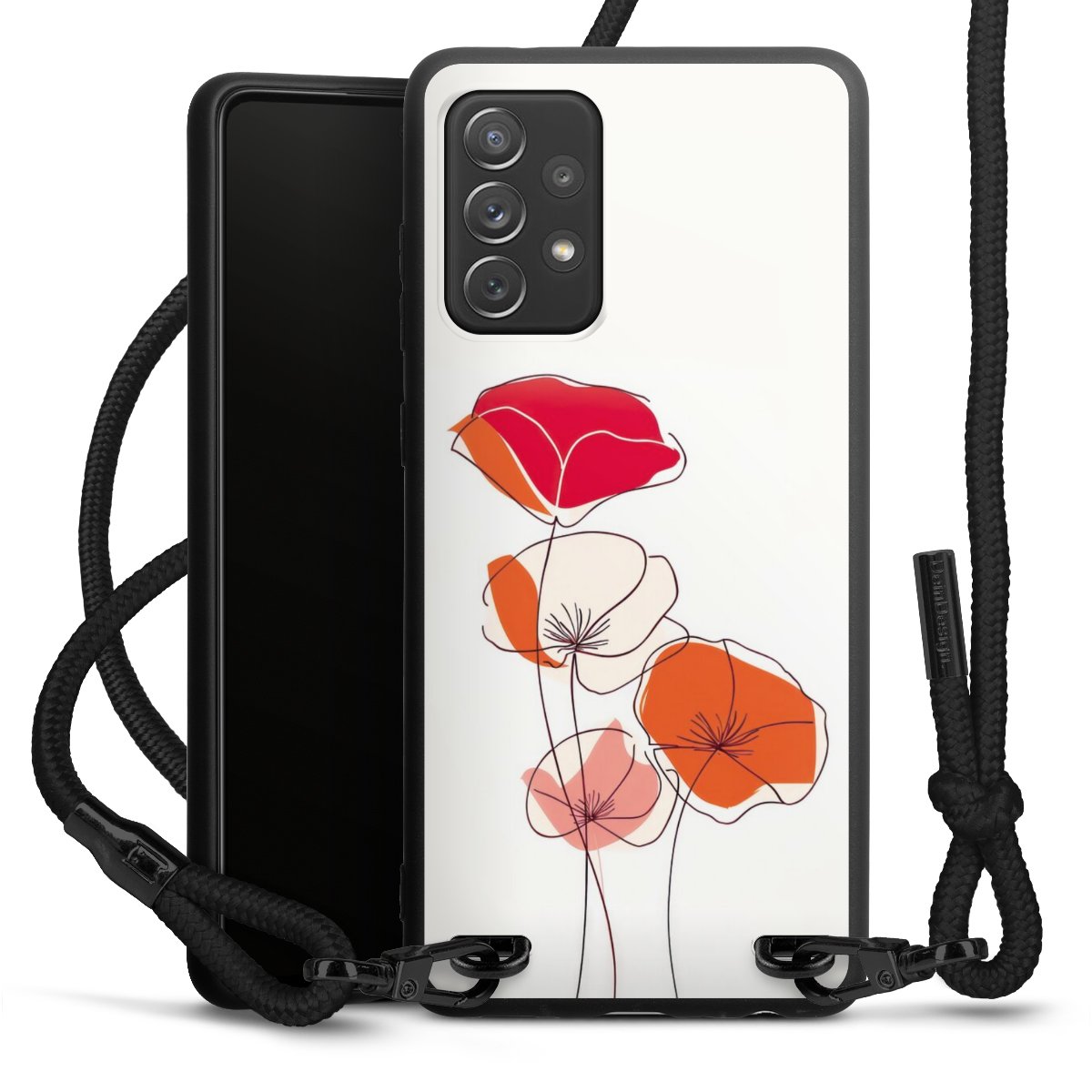 The matt black silicone case is made of flexible TPU (thermoplastic polyurethane) and offers robust protection. The durable, unbreakable material makes the cover flexible and dimensionally stable at the same time. The matte surface makes your design stand out more and is less susceptible to fingerprints and dirt. The stylish trend accessory fits comfortably in the hand and is perfectly complemented by the fabric (polyester) mobile phone strap. The braided fabric strap is approx. 1.70 metres long with a diameter of approx. 0.5 cm. Due to the special knotting technique, the length of the strap can be adjusted by simply pulling it, so that you can adapt it individually to your wishes. The practical case to wear around your neck is available with the fabric strap in black. As a little icing on the cake, we have provided the strap with a chic metal fastener in matt black. The strap is securely fastened to the case with loops made of high-quality genuine leather and press studs. The ends of the fabric strap are covered with metallic end caps and thus protected from fraying.