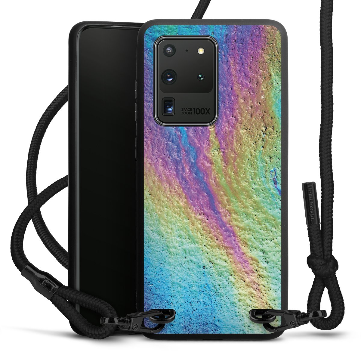 We use the solid direct print process for this phone case, which is why the print area only covers the back and the edge remains unprinted. The case to wear around your neck can be ordered unprinted, fully printed, or partially printed. For your design, either choose one of our exclusive shop motifs or get creative and create your own design, for example with photos and overlays. Design your own personal trend accessory and make an individual statement on the streets!