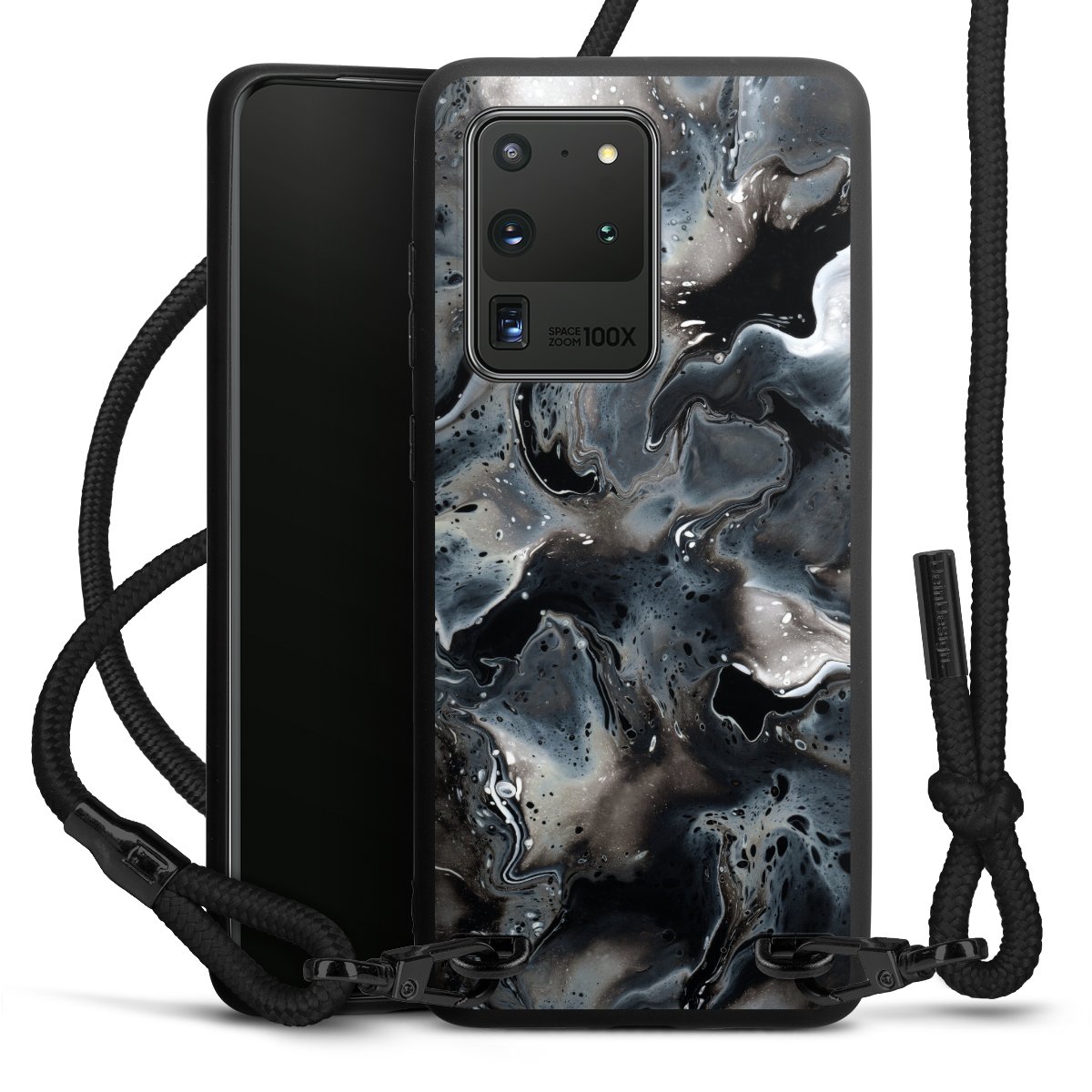 The matt black silicone case is made of flexible TPU (thermoplastic polyurethane) and offers robust protection. The durable, unbreakable material makes the cover flexible and dimensionally stable at the same time. The matte surface makes your design stand out more and is less susceptible to fingerprints and dirt. The stylish trend accessory fits comfortably in the hand and is perfectly complemented by the fabric (polyester) mobile phone strap. The braided fabric strap is approx. 1.70 metres long with a diameter of approx. 0.5 cm. Due to the special knotting technique, the length of the strap can be adjusted by simply pulling it, so that you can adapt it individually to your wishes. The practical case to wear around your neck is available with the fabric strap in black. As a little icing on the cake, we have provided the strap with a chic metal fastener in matt black. The strap is securely fastened to the case with loops made of high-quality genuine leather and press studs. The ends of the fabric strap are covered with metallic end caps and thus protected from fraying.