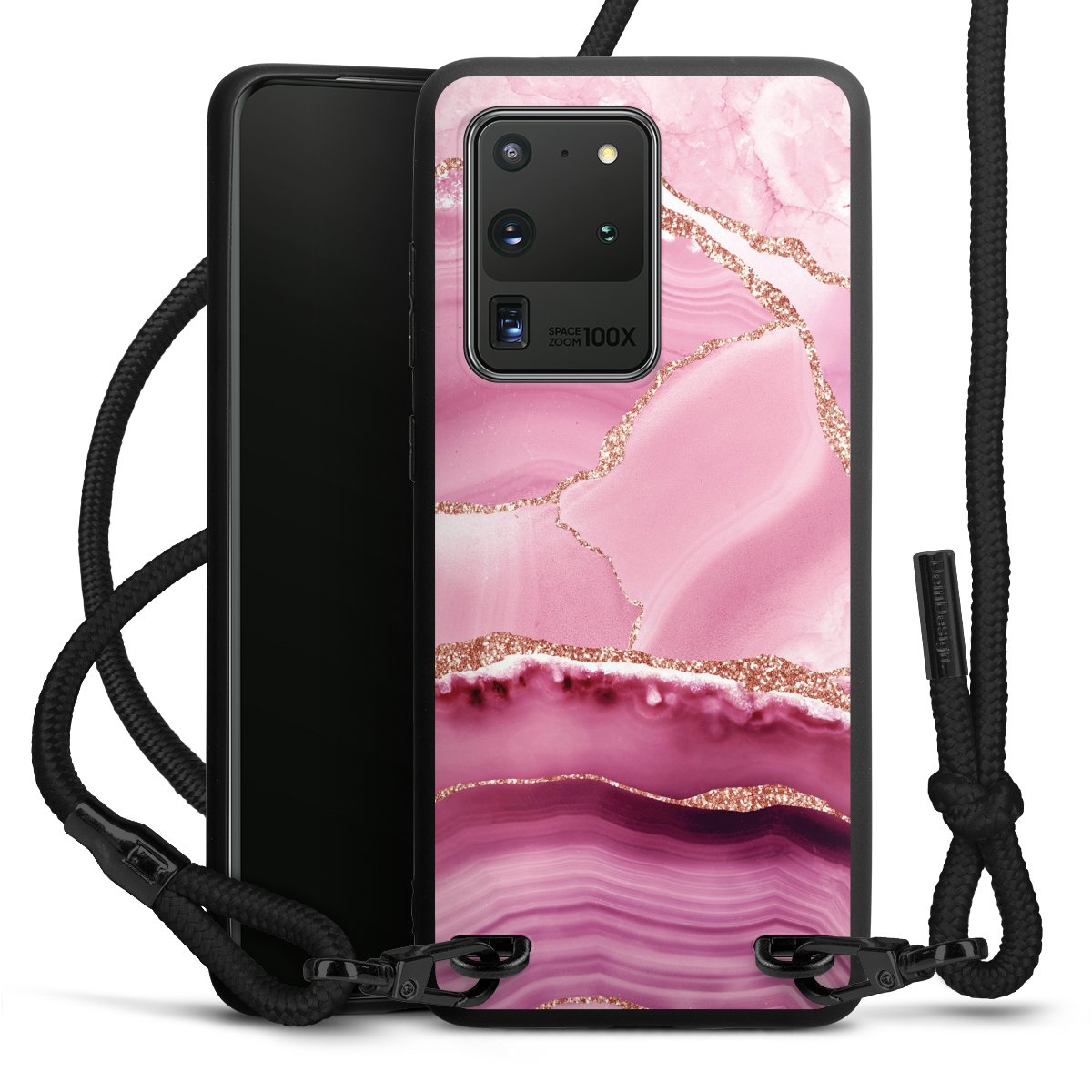 The matt black silicone case is made of flexible TPU (thermoplastic polyurethane) and offers robust protection. The durable, unbreakable material makes the cover flexible and dimensionally stable at the same time. The matte surface makes your design stand out more and is less susceptible to fingerprints and dirt. The stylish trend accessory fits comfortably in the hand and is perfectly complemented by the fabric (polyester) mobile phone strap. The braided fabric strap is approx. 1.70 metres long with a diameter of approx. 0.5 cm. Due to the special knotting technique, the length of the strap can be adjusted by simply pulling it, so that you can adapt it individually to your wishes. The practical case to wear around your neck is available with the fabric strap in black. As a little icing on the cake, we have provided the strap with a chic metal fastener in matt black. The strap is securely fastened to the case with loops made of high-quality genuine leather and press studs. The ends of the fabric strap are covered with metallic end caps and thus protected from fraying.
