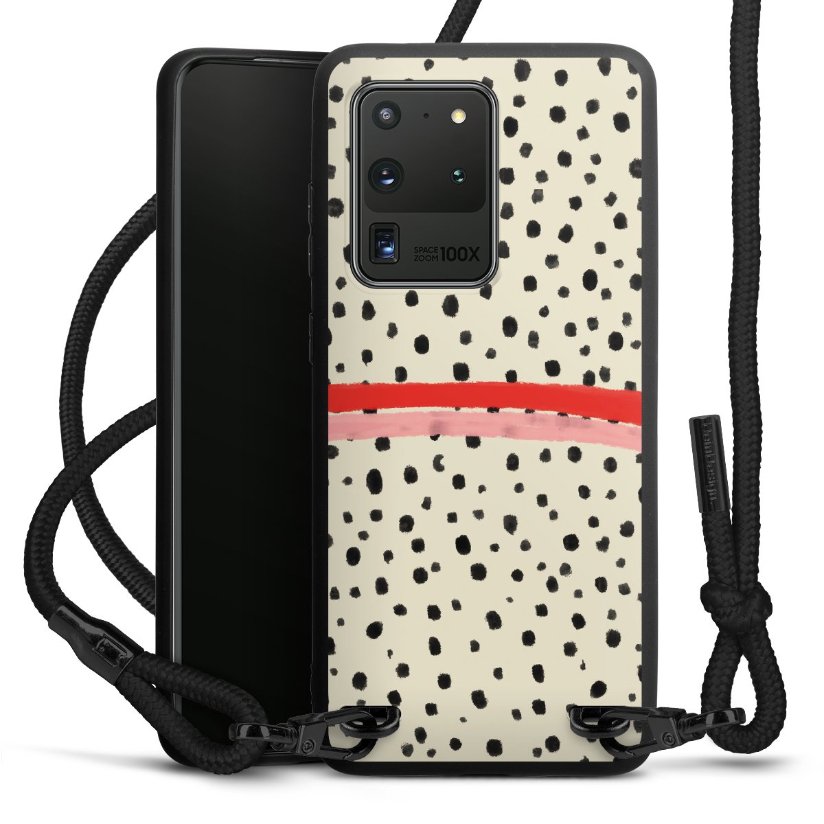 The matt black silicone case is made of flexible TPU (thermoplastic polyurethane) and offers robust protection. The durable, unbreakable material makes the cover flexible and dimensionally stable at the same time. The matte surface makes your design stand out more and is less susceptible to fingerprints and dirt. The stylish trend accessory fits comfortably in the hand and is perfectly complemented by the fabric (polyester) mobile phone strap. The braided fabric strap is approx. 1.70 metres long with a diameter of approx. 0.5 cm. Due to the special knotting technique, the length of the strap can be adjusted by simply pulling it, so that you can adapt it individually to your wishes. The practical case to wear around your neck is available with the fabric strap in black. As a little icing on the cake, we have provided the strap with a chic metal fastener in matt black. The strap is securely fastened to the case with loops made of high-quality genuine leather and press studs. The ends of the fabric strap are covered with metallic end caps and thus protected from fraying.