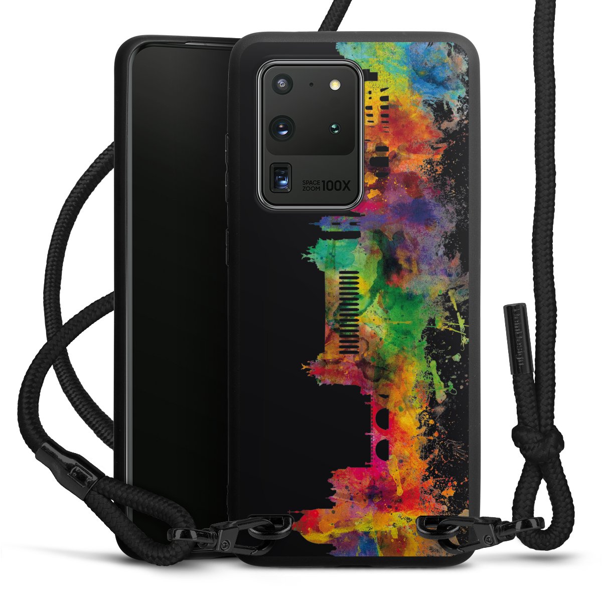 We use the solid direct print process for this phone case, which is why the print area only covers the back and the edge remains unprinted. The case to wear around your neck can be ordered unprinted, fully printed, or partially printed. For your design, either choose one of our exclusive shop motifs or get creative and create your own design, for example with photos and overlays. Design your own personal trend accessory and make an individual statement on the streets!