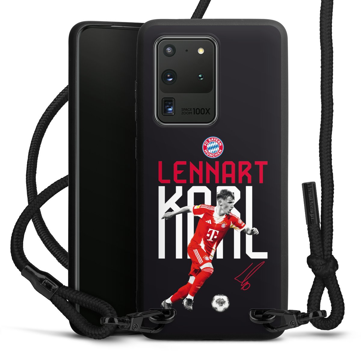 The matt black silicone case is made of flexible TPU (thermoplastic polyurethane) and offers robust protection. The durable, unbreakable material makes the cover flexible and dimensionally stable at the same time. The matte surface makes your design stand out more and is less susceptible to fingerprints and dirt. The stylish trend accessory fits comfortably in the hand and is perfectly complemented by the fabric (polyester) mobile phone strap. The braided fabric strap is approx. 1.70 metres long with a diameter of approx. 0.5 cm. Due to the special knotting technique, the length of the strap can be adjusted by simply pulling it, so that you can adapt it individually to your wishes. The practical case to wear around your neck is available with the fabric strap in black. As a little icing on the cake, we have provided the strap with a chic metal fastener in matt black. The strap is securely fastened to the case with loops made of high-quality genuine leather and press studs. The ends of the fabric strap are covered with metallic end caps and thus protected from fraying.