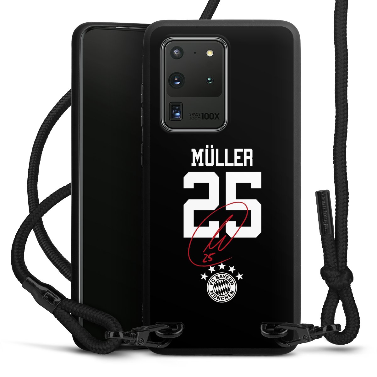 The matt black silicone case is made of flexible TPU (thermoplastic polyurethane) and offers robust protection. The durable, unbreakable material makes the cover flexible and dimensionally stable at the same time. The matte surface makes your design stand out more and is less susceptible to fingerprints and dirt. The stylish trend accessory fits comfortably in the hand and is perfectly complemented by the fabric (polyester) mobile phone strap. The braided fabric strap is approx. 1.70 metres long with a diameter of approx. 0.5 cm. Due to the special knotting technique, the length of the strap can be adjusted by simply pulling it, so that you can adapt it individually to your wishes. The practical case to wear around your neck is available with the fabric strap in black. As a little icing on the cake, we have provided the strap with a chic metal fastener in matt black. The strap is securely fastened to the case with loops made of high-quality genuine leather and press studs. The ends of the fabric strap are covered with metallic end caps and thus protected from fraying.