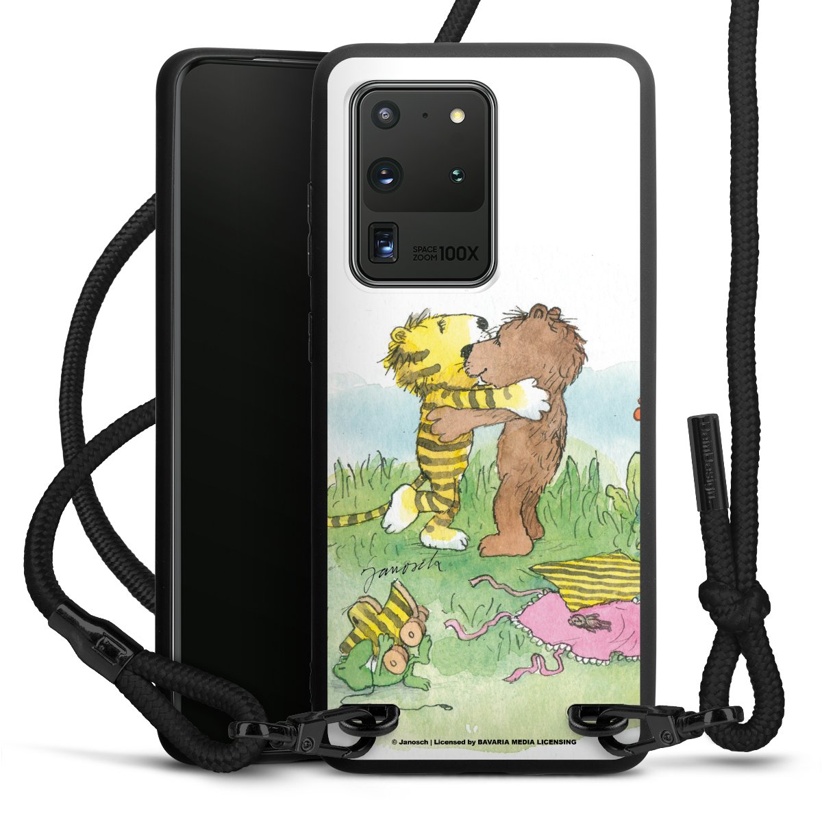 The matt black silicone case is made of flexible TPU (thermoplastic polyurethane) and offers robust protection. The durable, unbreakable material makes the cover flexible and dimensionally stable at the same time. The matte surface makes your design stand out more and is less susceptible to fingerprints and dirt. The stylish trend accessory fits comfortably in the hand and is perfectly complemented by the fabric (polyester) mobile phone strap. The braided fabric strap is approx. 1.70 metres long with a diameter of approx. 0.5 cm. Due to the special knotting technique, the length of the strap can be adjusted by simply pulling it, so that you can adapt it individually to your wishes. The practical case to wear around your neck is available with the fabric strap in black. As a little icing on the cake, we have provided the strap with a chic metal fastener in matt black. The strap is securely fastened to the case with loops made of high-quality genuine leather and press studs. The ends of the fabric strap are covered with metallic end caps and thus protected from fraying.