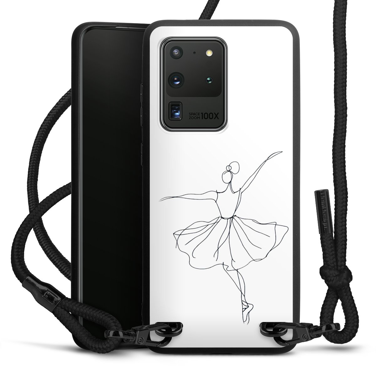 The matt black silicone case is made of flexible TPU (thermoplastic polyurethane) and offers robust protection. The durable, unbreakable material makes the cover flexible and dimensionally stable at the same time. The matte surface makes your design stand out more and is less susceptible to fingerprints and dirt. The stylish trend accessory fits comfortably in the hand and is perfectly complemented by the fabric (polyester) mobile phone strap. The braided fabric strap is approx. 1.70 metres long with a diameter of approx. 0.5 cm. Due to the special knotting technique, the length of the strap can be adjusted by simply pulling it, so that you can adapt it individually to your wishes. The practical case to wear around your neck is available with the fabric strap in black. As a little icing on the cake, we have provided the strap with a chic metal fastener in matt black. The strap is securely fastened to the case with loops made of high-quality genuine leather and press studs. The ends of the fabric strap are covered with metallic end caps and thus protected from fraying.