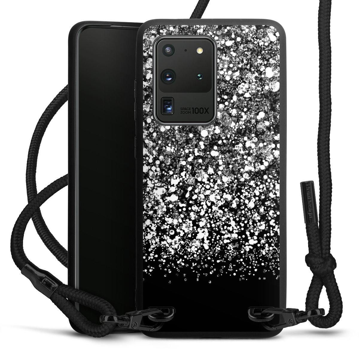 The matt black silicone case is made of flexible TPU (thermoplastic polyurethane) and offers robust protection. The durable, unbreakable material makes the cover flexible and dimensionally stable at the same time. The matte surface makes your design stand out more and is less susceptible to fingerprints and dirt. The stylish trend accessory fits comfortably in the hand and is perfectly complemented by the fabric (polyester) mobile phone strap. The braided fabric strap is approx. 1.70 metres long with a diameter of approx. 0.5 cm. Due to the special knotting technique, the length of the strap can be adjusted by simply pulling it, so that you can adapt it individually to your wishes. The practical case to wear around your neck is available with the fabric strap in black. As a little icing on the cake, we have provided the strap with a chic metal fastener in matt black. The strap is securely fastened to the case with loops made of high-quality genuine leather and press studs. The ends of the fabric strap are covered with metallic end caps and thus protected from fraying.