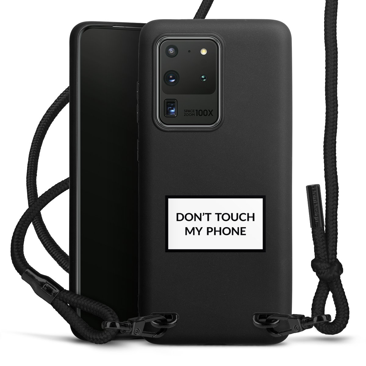 The matt black silicone case is made of flexible TPU (thermoplastic polyurethane) and offers robust protection. The durable, unbreakable material makes the cover flexible and dimensionally stable at the same time. The matte surface makes your design stand out more and is less susceptible to fingerprints and dirt. The stylish trend accessory fits comfortably in the hand and is perfectly complemented by the fabric (polyester) mobile phone strap. The braided fabric strap is approx. 1.70 metres long with a diameter of approx. 0.5 cm. Due to the special knotting technique, the length of the strap can be adjusted by simply pulling it, so that you can adapt it individually to your wishes. The practical case to wear around your neck is available with the fabric strap in black. As a little icing on the cake, we have provided the strap with a chic metal fastener in matt black. The strap is securely fastened to the case with loops made of high-quality genuine leather and press studs. The ends of the fabric strap are covered with metallic end caps and thus protected from fraying.