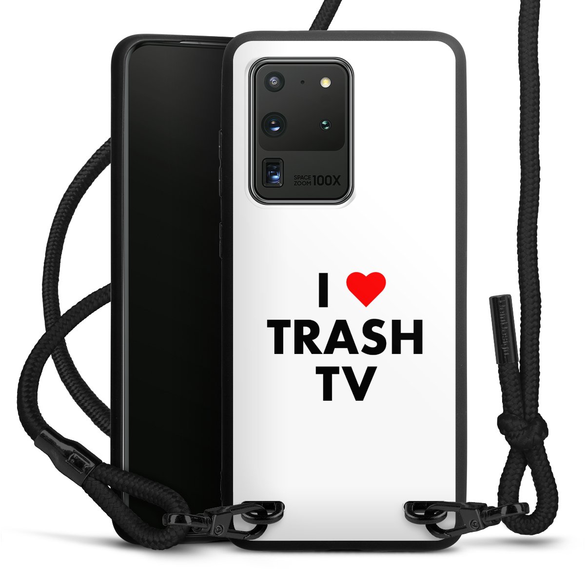The matt black silicone case is made of flexible TPU (thermoplastic polyurethane) and offers robust protection. The durable, unbreakable material makes the cover flexible and dimensionally stable at the same time. The matte surface makes your design stand out more and is less susceptible to fingerprints and dirt. The stylish trend accessory fits comfortably in the hand and is perfectly complemented by the fabric (polyester) mobile phone strap. The braided fabric strap is approx. 1.70 metres long with a diameter of approx. 0.5 cm. Due to the special knotting technique, the length of the strap can be adjusted by simply pulling it, so that you can adapt it individually to your wishes. The practical case to wear around your neck is available with the fabric strap in black. As a little icing on the cake, we have provided the strap with a chic metal fastener in matt black. The strap is securely fastened to the case with loops made of high-quality genuine leather and press studs. The ends of the fabric strap are covered with metallic end caps and thus protected from fraying.