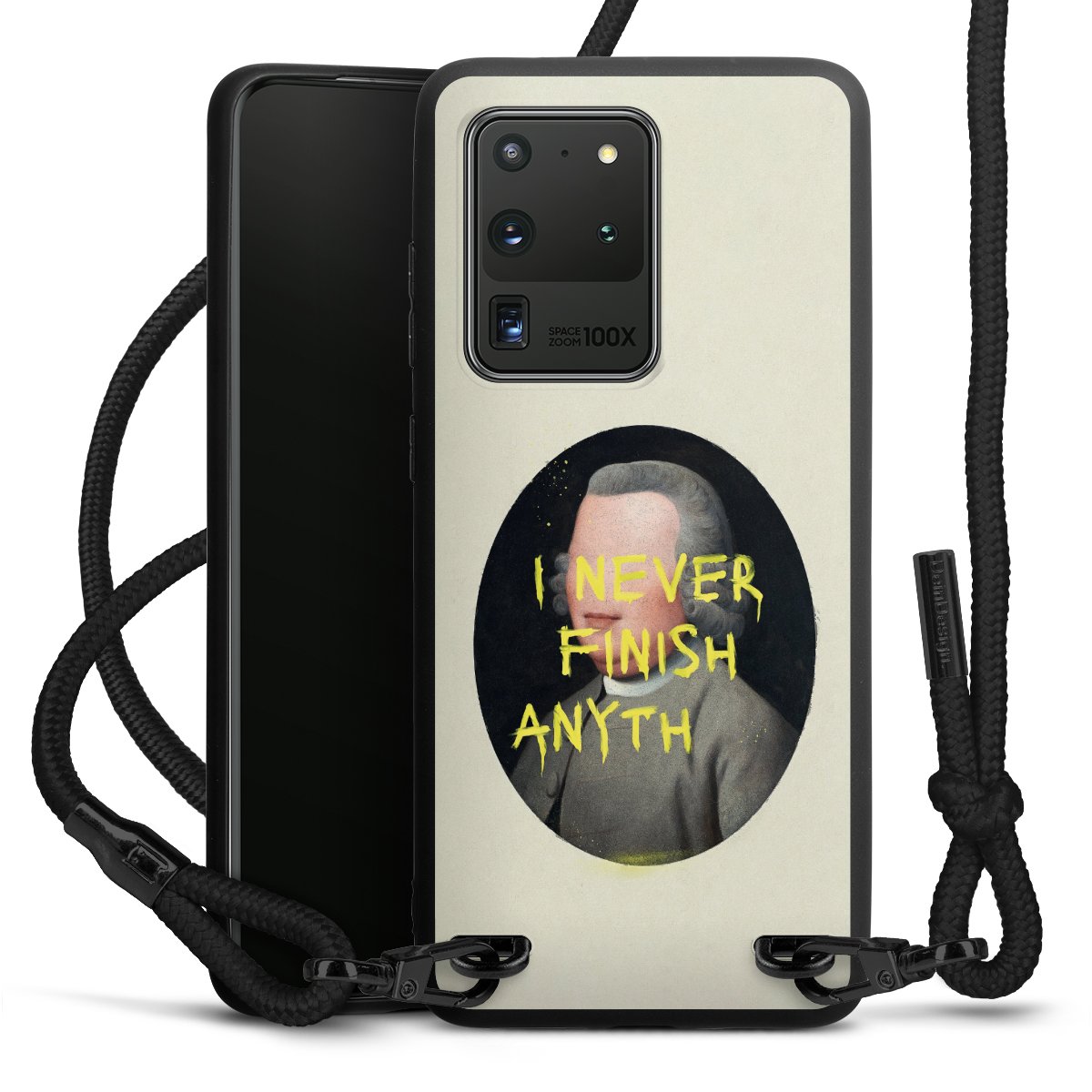 The matt black silicone case is made of flexible TPU (thermoplastic polyurethane) and offers robust protection. The durable, unbreakable material makes the cover flexible and dimensionally stable at the same time. The matte surface makes your design stand out more and is less susceptible to fingerprints and dirt. The stylish trend accessory fits comfortably in the hand and is perfectly complemented by the fabric (polyester) mobile phone strap. The braided fabric strap is approx. 1.70 metres long with a diameter of approx. 0.5 cm. Due to the special knotting technique, the length of the strap can be adjusted by simply pulling it, so that you can adapt it individually to your wishes. The practical case to wear around your neck is available with the fabric strap in black. As a little icing on the cake, we have provided the strap with a chic metal fastener in matt black. The strap is securely fastened to the case with loops made of high-quality genuine leather and press studs. The ends of the fabric strap are covered with metallic end caps and thus protected from fraying.