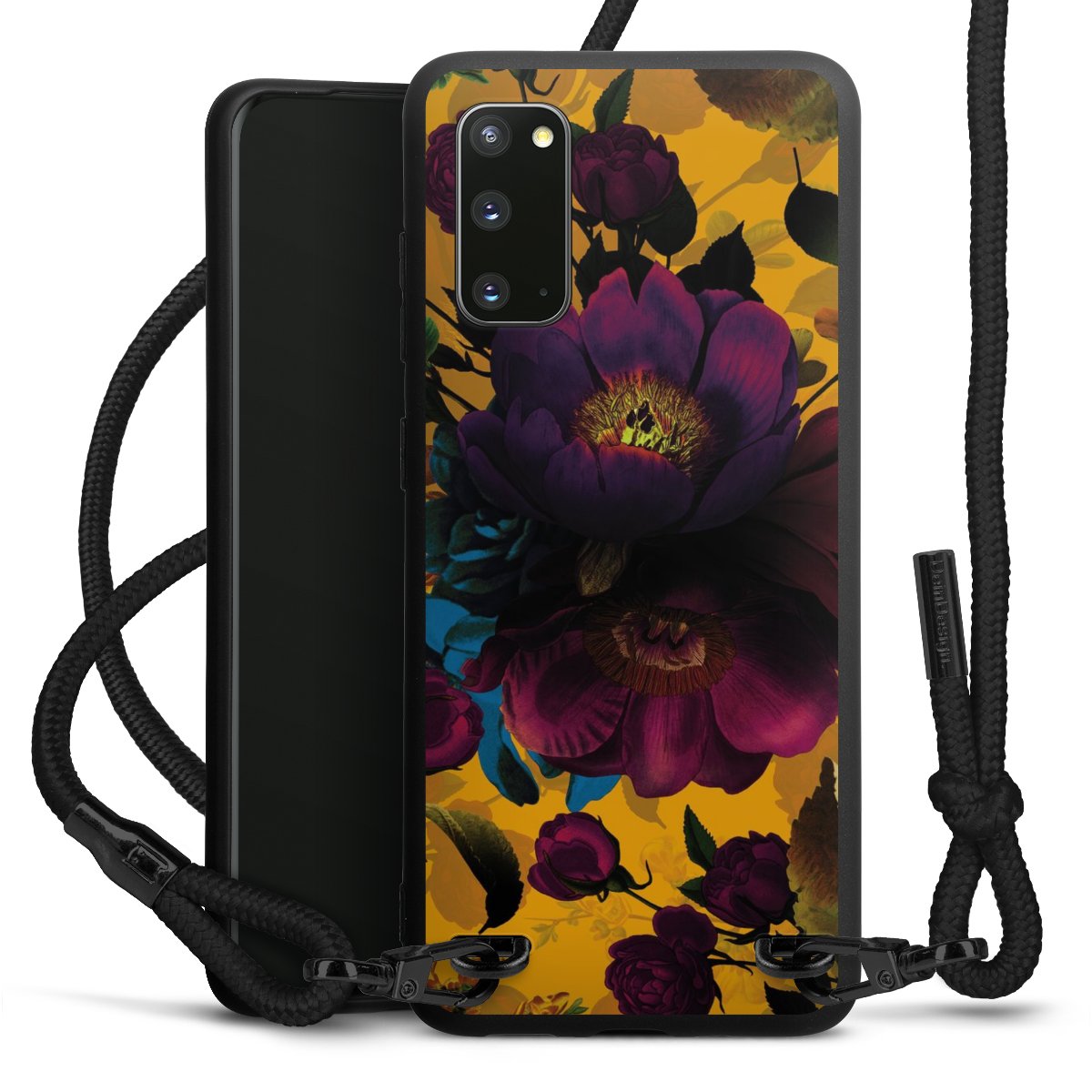 The matt black silicone case is made of flexible TPU (thermoplastic polyurethane) and offers robust protection. The durable, unbreakable material makes the cover flexible and dimensionally stable at the same time. The matte surface makes your design stand out more and is less susceptible to fingerprints and dirt. The stylish trend accessory fits comfortably in the hand and is perfectly complemented by the fabric (polyester) mobile phone strap. The braided fabric strap is approx. 1.70 metres long with a diameter of approx. 0.5 cm. Due to the special knotting technique, the length of the strap can be adjusted by simply pulling it, so that you can adapt it individually to your wishes. The practical case to wear around your neck is available with the fabric strap in black. As a little icing on the cake, we have provided the strap with a chic metal fastener in matt black. The strap is securely fastened to the case with loops made of high-quality genuine leather and press studs. The ends of the fabric strap are covered with metallic end caps and thus protected from fraying.