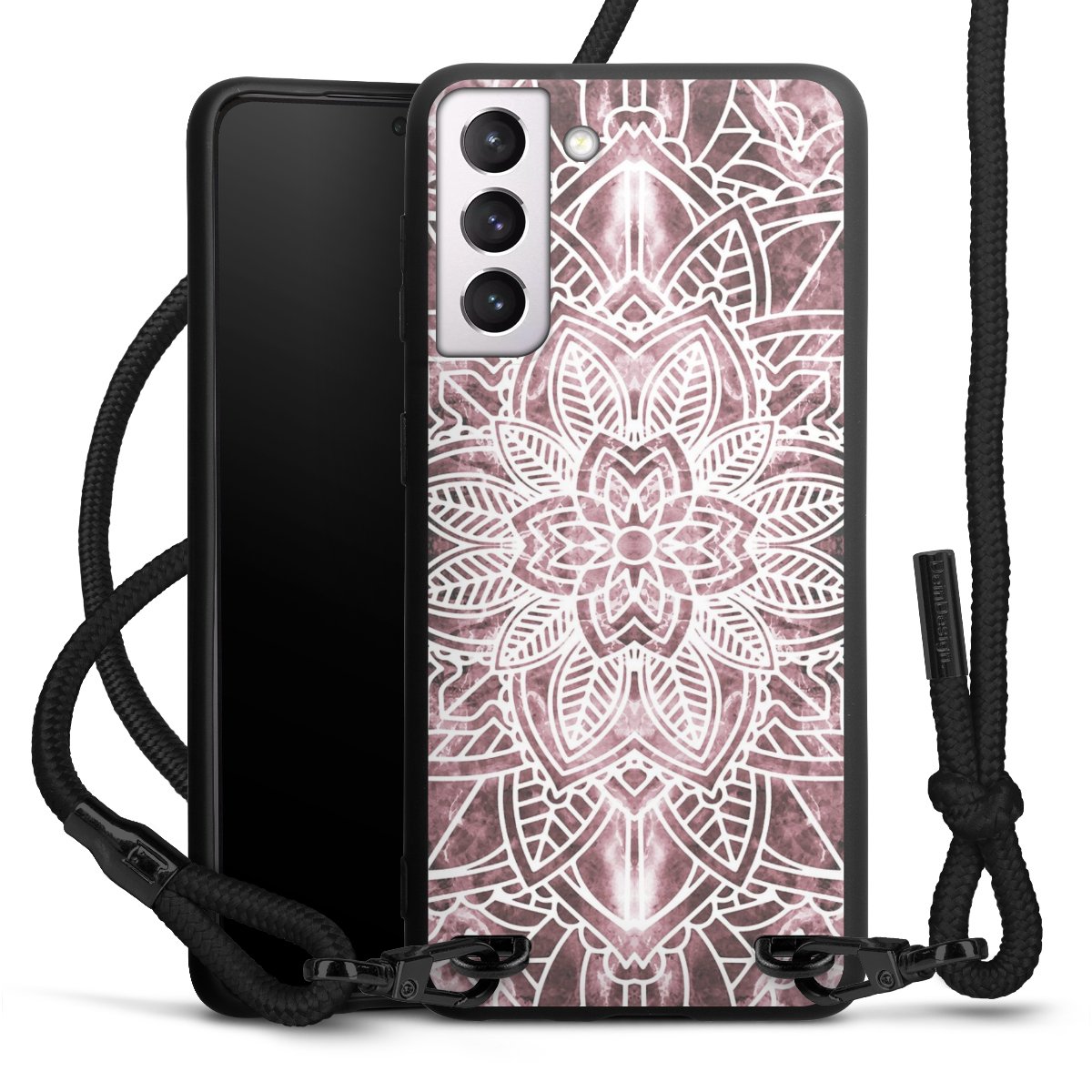 The matt black silicone case is made of flexible TPU (thermoplastic polyurethane) and offers robust protection. The durable, unbreakable material makes the cover flexible and dimensionally stable at the same time. The matte surface makes your design stand out more and is less susceptible to fingerprints and dirt. The stylish trend accessory fits comfortably in the hand and is perfectly complemented by the fabric (polyester) mobile phone strap. The braided fabric strap is approx. 1.70 metres long with a diameter of approx. 0.5 cm. Due to the special knotting technique, the length of the strap can be adjusted by simply pulling it, so that you can adapt it individually to your wishes. The practical case to wear around your neck is available with the fabric strap in black. As a little icing on the cake, we have provided the strap with a chic metal fastener in matt black. The strap is securely fastened to the case with loops made of high-quality genuine leather and press studs. The ends of the fabric strap are covered with metallic end caps and thus protected from fraying.