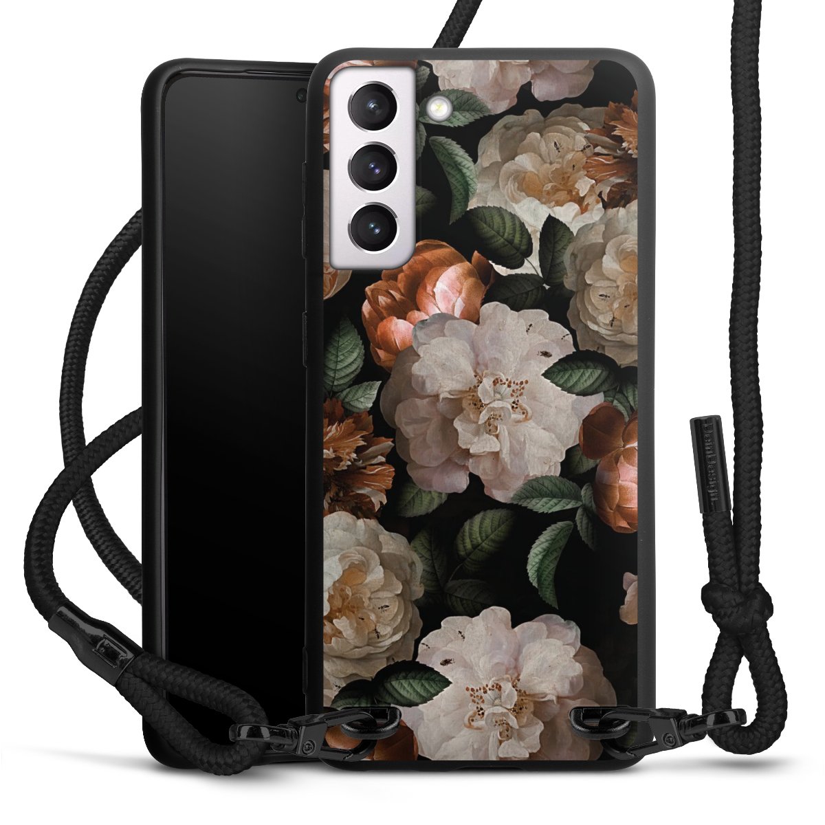 The matt black silicone case is made of flexible TPU (thermoplastic polyurethane) and offers robust protection. The durable, unbreakable material makes the cover flexible and dimensionally stable at the same time. The matte surface makes your design stand out more and is less susceptible to fingerprints and dirt. The stylish trend accessory fits comfortably in the hand and is perfectly complemented by the fabric (polyester) mobile phone strap. The braided fabric strap is approx. 1.70 metres long with a diameter of approx. 0.5 cm. Due to the special knotting technique, the length of the strap can be adjusted by simply pulling it, so that you can adapt it individually to your wishes. The practical case to wear around your neck is available with the fabric strap in black. As a little icing on the cake, we have provided the strap with a chic metal fastener in matt black. The strap is securely fastened to the case with loops made of high-quality genuine leather and press studs. The ends of the fabric strap are covered with metallic end caps and thus protected from fraying.