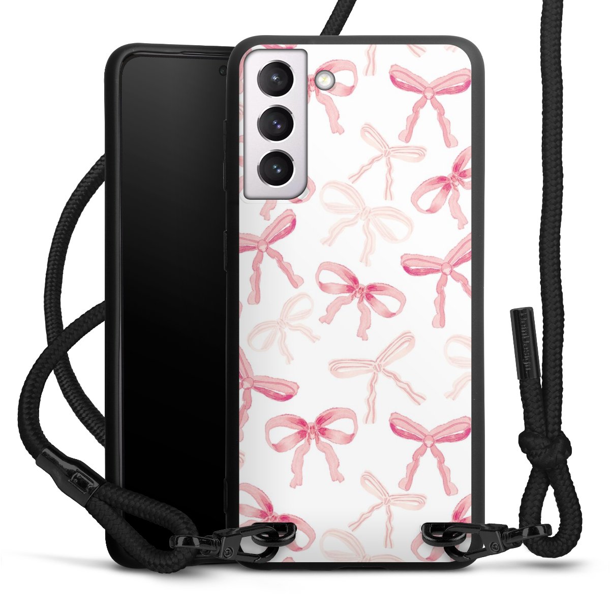 The matt black silicone case is made of flexible TPU (thermoplastic polyurethane) and offers robust protection. The durable, unbreakable material makes the cover flexible and dimensionally stable at the same time. The matte surface makes your design stand out more and is less susceptible to fingerprints and dirt. The stylish trend accessory fits comfortably in the hand and is perfectly complemented by the fabric (polyester) mobile phone strap. The braided fabric strap is approx. 1.70 metres long with a diameter of approx. 0.5 cm. Due to the special knotting technique, the length of the strap can be adjusted by simply pulling it, so that you can adapt it individually to your wishes. The practical case to wear around your neck is available with the fabric strap in black. As a little icing on the cake, we have provided the strap with a chic metal fastener in matt black. The strap is securely fastened to the case with loops made of high-quality genuine leather and press studs. The ends of the fabric strap are covered with metallic end caps and thus protected from fraying.
