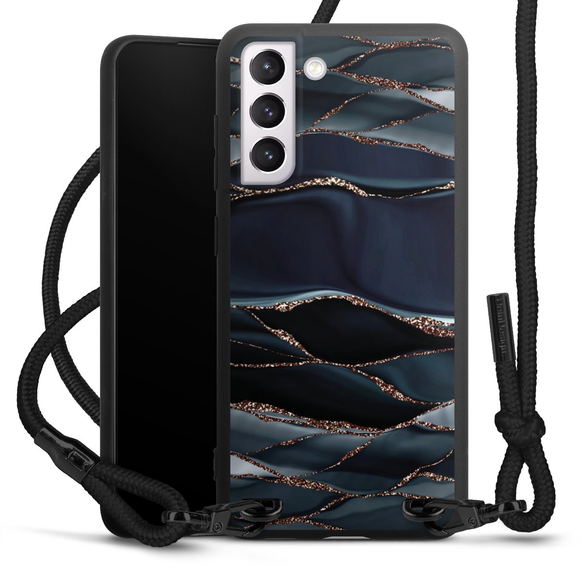 The matt black silicone case is made of flexible TPU (thermoplastic polyurethane) and offers robust protection. The durable, unbreakable material makes the cover flexible and dimensionally stable at the same time. The matte surface makes your design stand out more and is less susceptible to fingerprints and dirt. The stylish trend accessory fits comfortably in the hand and is perfectly complemented by the fabric (polyester) mobile phone strap. The braided fabric strap is approx. 1.70 metres long with a diameter of approx. 0.5 cm. Due to the special knotting technique, the length of the strap can be adjusted by simply pulling it, so that you can adapt it individually to your wishes. The practical case to wear around your neck is available with the fabric strap in black. As a little icing on the cake, we have provided the strap with a chic metal fastener in matt black. The strap is securely fastened to the case with loops made of high-quality genuine leather and press studs. The ends of the fabric strap are covered with metallic end caps and thus protected from fraying.