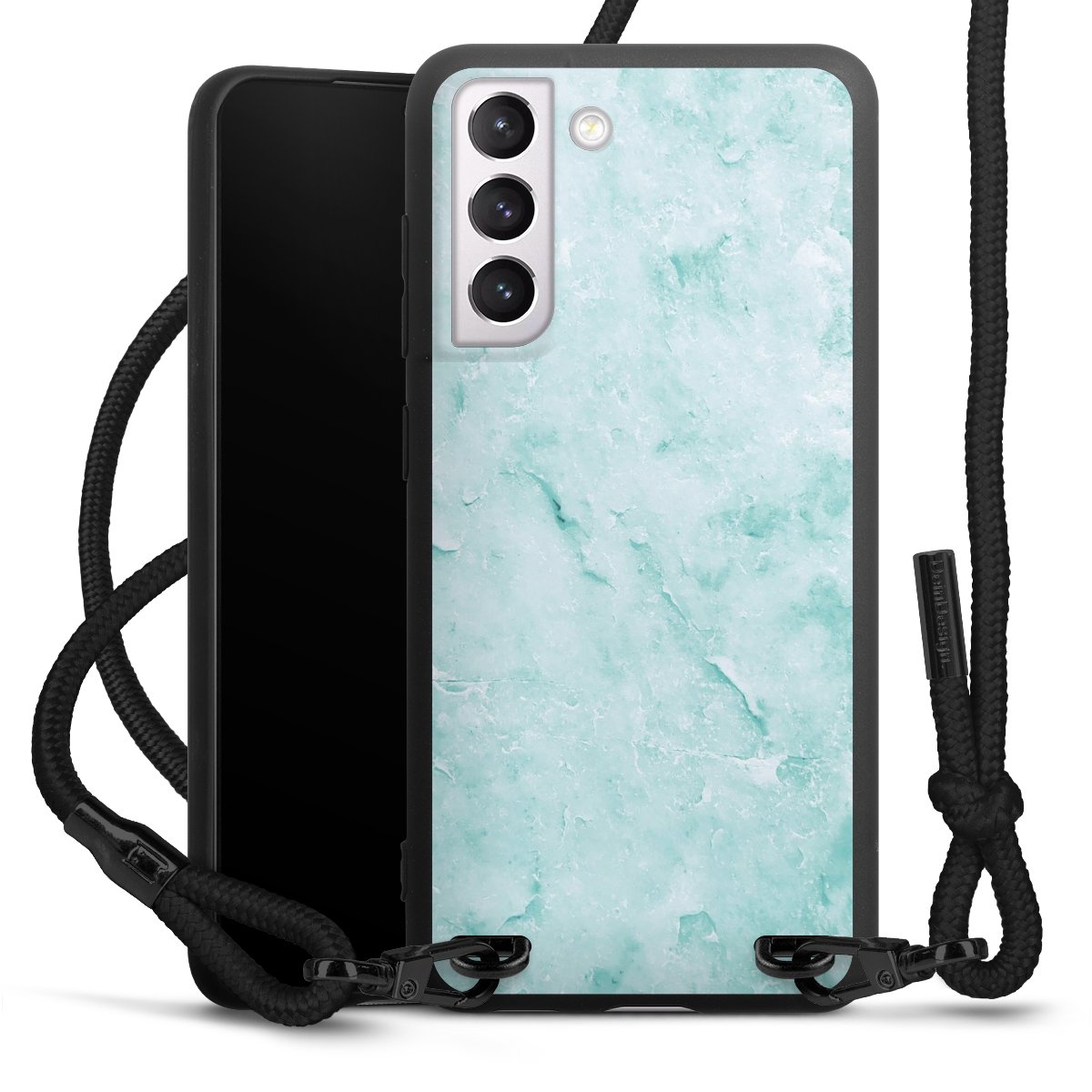 The matt black silicone case is made of flexible TPU (thermoplastic polyurethane) and offers robust protection. The durable, unbreakable material makes the cover flexible and dimensionally stable at the same time. The matte surface makes your design stand out more and is less susceptible to fingerprints and dirt. The stylish trend accessory fits comfortably in the hand and is perfectly complemented by the fabric (polyester) mobile phone strap. The braided fabric strap is approx. 1.70 metres long with a diameter of approx. 0.5 cm. Due to the special knotting technique, the length of the strap can be adjusted by simply pulling it, so that you can adapt it individually to your wishes. The practical case to wear around your neck is available with the fabric strap in black. As a little icing on the cake, we have provided the strap with a chic metal fastener in matt black. The strap is securely fastened to the case with loops made of high-quality genuine leather and press studs. The ends of the fabric strap are covered with metallic end caps and thus protected from fraying.