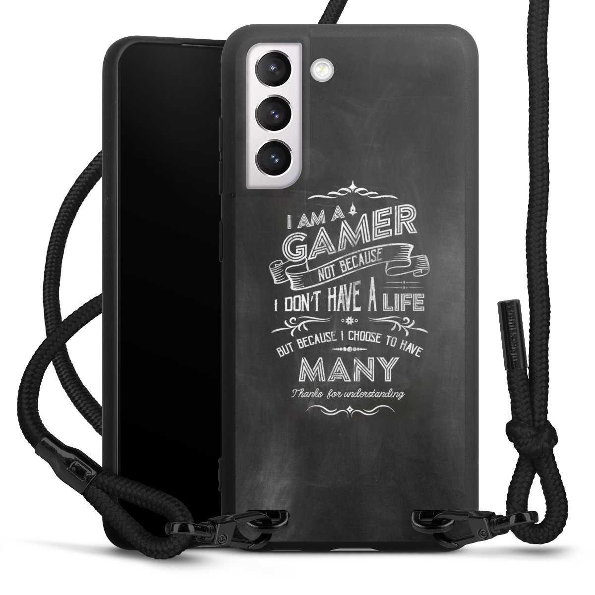The matt black silicone case is made of flexible TPU (thermoplastic polyurethane) and offers robust protection. The durable, unbreakable material makes the cover flexible and dimensionally stable at the same time. The matte surface makes your design stand out more and is less susceptible to fingerprints and dirt. The stylish trend accessory fits comfortably in the hand and is perfectly complemented by the fabric (polyester) mobile phone strap. The braided fabric strap is approx. 1.70 metres long with a diameter of approx. 0.5 cm. Due to the special knotting technique, the length of the strap can be adjusted by simply pulling it, so that you can adapt it individually to your wishes. The practical case to wear around your neck is available with the fabric strap in black. As a little icing on the cake, we have provided the strap with a chic metal fastener in matt black. The strap is securely fastened to the case with loops made of high-quality genuine leather and press studs. The ends of the fabric strap are covered with metallic end caps and thus protected from fraying.