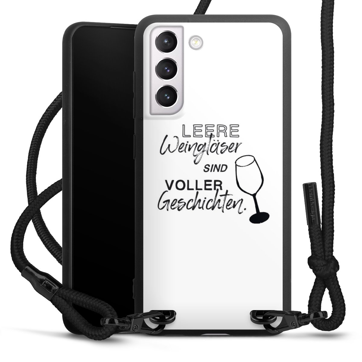 The matt black silicone case is made of flexible TPU (thermoplastic polyurethane) and offers robust protection. The durable, unbreakable material makes the cover flexible and dimensionally stable at the same time. The matte surface makes your design stand out more and is less susceptible to fingerprints and dirt. The stylish trend accessory fits comfortably in the hand and is perfectly complemented by the fabric (polyester) mobile phone strap. The braided fabric strap is approx. 1.70 metres long with a diameter of approx. 0.5 cm. Due to the special knotting technique, the length of the strap can be adjusted by simply pulling it, so that you can adapt it individually to your wishes. The practical case to wear around your neck is available with the fabric strap in black. As a little icing on the cake, we have provided the strap with a chic metal fastener in matt black. The strap is securely fastened to the case with loops made of high-quality genuine leather and press studs. The ends of the fabric strap are covered with metallic end caps and thus protected from fraying.