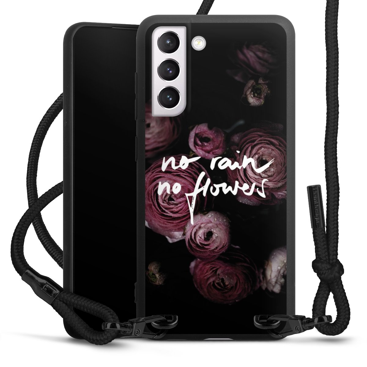 The matt black silicone case is made of flexible TPU (thermoplastic polyurethane) and offers robust protection. The durable, unbreakable material makes the cover flexible and dimensionally stable at the same time. The matte surface makes your design stand out more and is less susceptible to fingerprints and dirt. The stylish trend accessory fits comfortably in the hand and is perfectly complemented by the fabric (polyester) mobile phone strap. The braided fabric strap is approx. 1.70 metres long with a diameter of approx. 0.5 cm. Due to the special knotting technique, the length of the strap can be adjusted by simply pulling it, so that you can adapt it individually to your wishes. The practical case to wear around your neck is available with the fabric strap in black. As a little icing on the cake, we have provided the strap with a chic metal fastener in matt black. The strap is securely fastened to the case with loops made of high-quality genuine leather and press studs. The ends of the fabric strap are covered with metallic end caps and thus protected from fraying.
