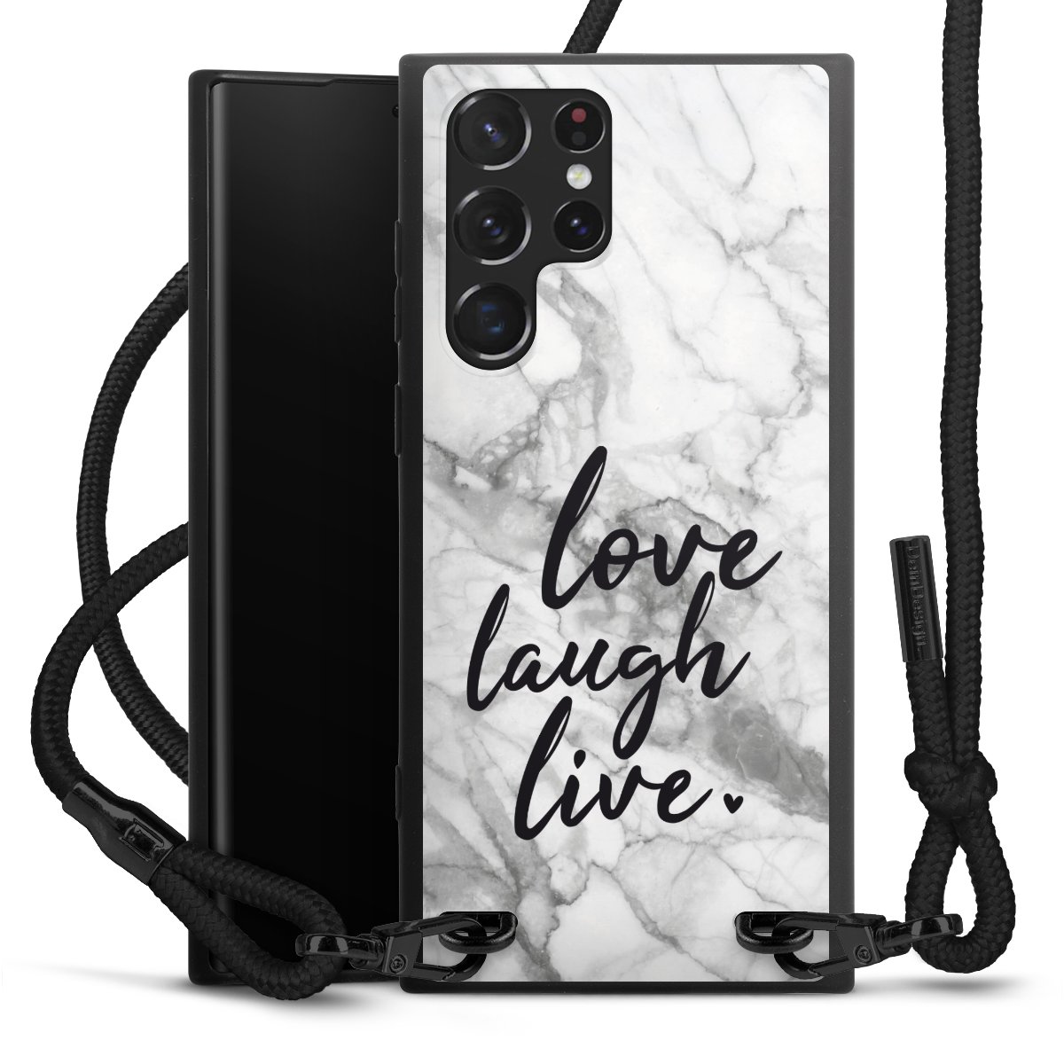 The matt black silicone case is made of flexible TPU (thermoplastic polyurethane) and offers robust protection. The durable, unbreakable material makes the cover flexible and dimensionally stable at the same time. The matte surface makes your design stand out more and is less susceptible to fingerprints and dirt. The stylish trend accessory fits comfortably in the hand and is perfectly complemented by the fabric (polyester) mobile phone strap. The braided fabric strap is approx. 1.70 metres long with a diameter of approx. 0.5 cm. Due to the special knotting technique, the length of the strap can be adjusted by simply pulling it, so that you can adapt it individually to your wishes. The practical case to wear around your neck is available with the fabric strap in black. As a little icing on the cake, we have provided the strap with a chic metal fastener in matt black. The strap is securely fastened to the case with loops made of high-quality genuine leather and press studs. The ends of the fabric strap are covered with metallic end caps and thus protected from fraying.