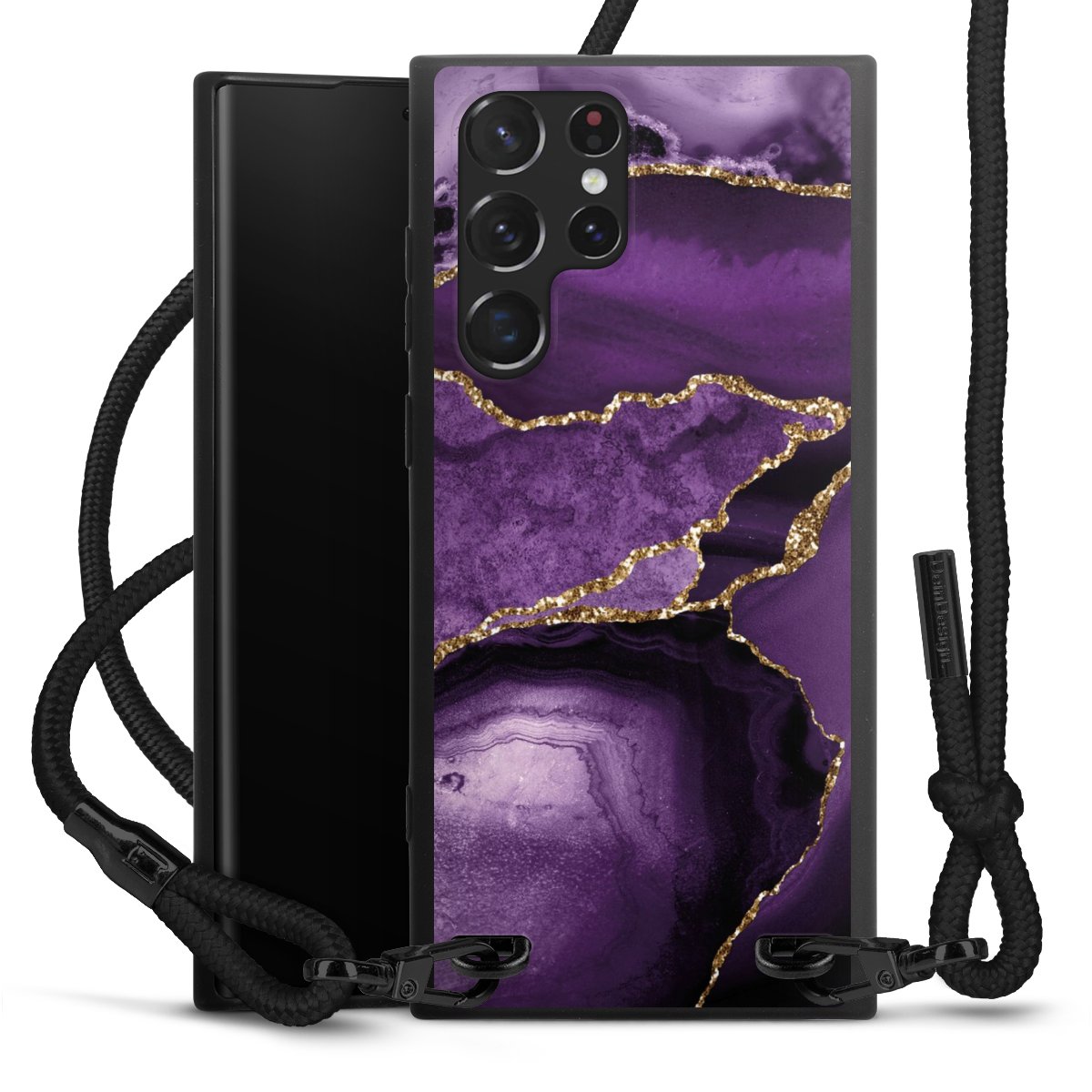 The matt black silicone case is made of flexible TPU (thermoplastic polyurethane) and offers robust protection. The durable, unbreakable material makes the cover flexible and dimensionally stable at the same time. The matte surface makes your design stand out more and is less susceptible to fingerprints and dirt. The stylish trend accessory fits comfortably in the hand and is perfectly complemented by the fabric (polyester) mobile phone strap. The braided fabric strap is approx. 1.70 metres long with a diameter of approx. 0.5 cm. Due to the special knotting technique, the length of the strap can be adjusted by simply pulling it, so that you can adapt it individually to your wishes. The practical case to wear around your neck is available with the fabric strap in black. As a little icing on the cake, we have provided the strap with a chic metal fastener in matt black. The strap is securely fastened to the case with loops made of high-quality genuine leather and press studs. The ends of the fabric strap are covered with metallic end caps and thus protected from fraying.