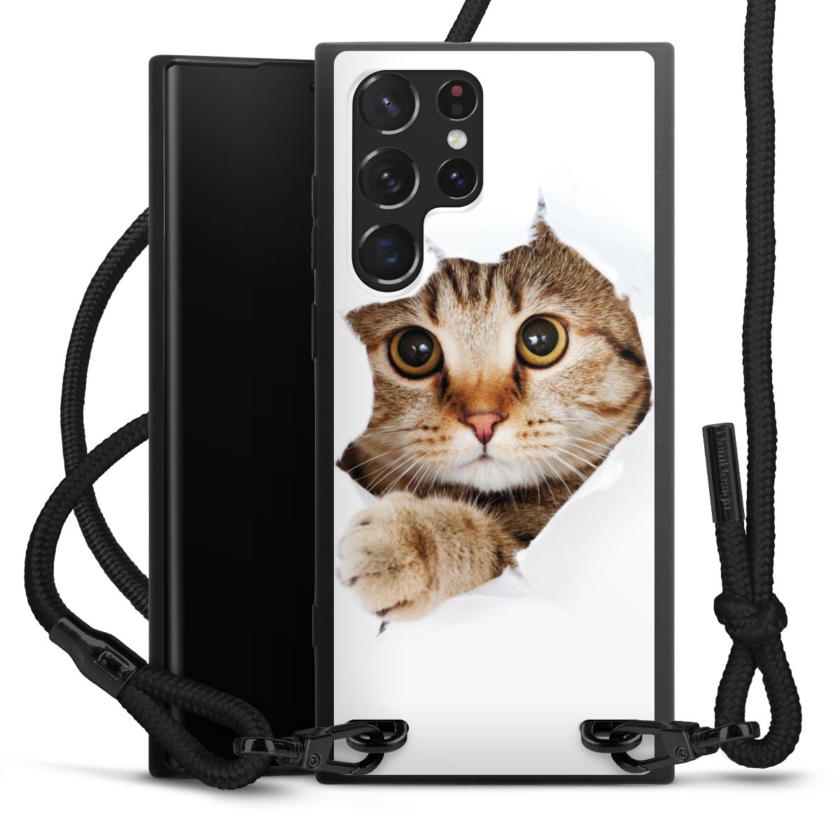 The matt black silicone case is made of flexible TPU (thermoplastic polyurethane) and offers robust protection. The durable, unbreakable material makes the cover flexible and dimensionally stable at the same time. The matte surface makes your design stand out more and is less susceptible to fingerprints and dirt. The stylish trend accessory fits comfortably in the hand and is perfectly complemented by the fabric (polyester) mobile phone strap. The braided fabric strap is approx. 1.70 metres long with a diameter of approx. 0.5 cm. Due to the special knotting technique, the length of the strap can be adjusted by simply pulling it, so that you can adapt it individually to your wishes. The practical case to wear around your neck is available with the fabric strap in black. As a little icing on the cake, we have provided the strap with a chic metal fastener in matt black. The strap is securely fastened to the case with loops made of high-quality genuine leather and press studs. The ends of the fabric strap are covered with metallic end caps and thus protected from fraying.
