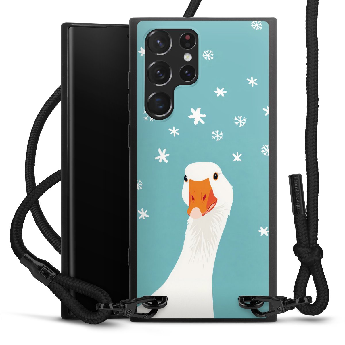 The matt black silicone case is made of flexible TPU (thermoplastic polyurethane) and offers robust protection. The durable, unbreakable material makes the cover flexible and dimensionally stable at the same time. The matte surface makes your design stand out more and is less susceptible to fingerprints and dirt. The stylish trend accessory fits comfortably in the hand and is perfectly complemented by the fabric (polyester) mobile phone strap. The braided fabric strap is approx. 1.70 metres long with a diameter of approx. 0.5 cm. Due to the special knotting technique, the length of the strap can be adjusted by simply pulling it, so that you can adapt it individually to your wishes. The practical case to wear around your neck is available with the fabric strap in black. As a little icing on the cake, we have provided the strap with a chic metal fastener in matt black. The strap is securely fastened to the case with loops made of high-quality genuine leather and press studs. The ends of the fabric strap are covered with metallic end caps and thus protected from fraying.