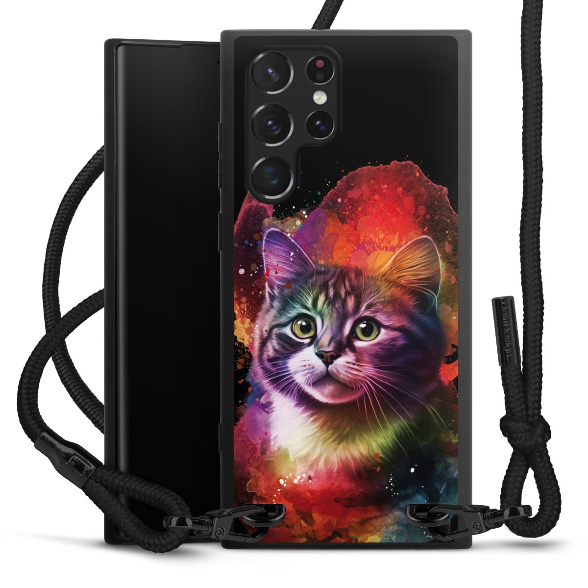 The matt black silicone case is made of flexible TPU (thermoplastic polyurethane) and offers robust protection. The durable, unbreakable material makes the cover flexible and dimensionally stable at the same time. The matte surface makes your design stand out more and is less susceptible to fingerprints and dirt. The stylish trend accessory fits comfortably in the hand and is perfectly complemented by the fabric (polyester) mobile phone strap. The braided fabric strap is approx. 1.70 metres long with a diameter of approx. 0.5 cm. Due to the special knotting technique, the length of the strap can be adjusted by simply pulling it, so that you can adapt it individually to your wishes. The practical case to wear around your neck is available with the fabric strap in black. As a little icing on the cake, we have provided the strap with a chic metal fastener in matt black. The strap is securely fastened to the case with loops made of high-quality genuine leather and press studs. The ends of the fabric strap are covered with metallic end caps and thus protected from fraying.