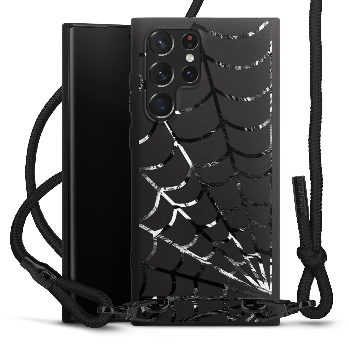 The matt black silicone case is made of flexible TPU (thermoplastic polyurethane) and offers robust protection. The durable, unbreakable material makes the cover flexible and dimensionally stable at the same time. The matte surface makes your design stand out more and is less susceptible to fingerprints and dirt. The stylish trend accessory fits comfortably in the hand and is perfectly complemented by the fabric (polyester) mobile phone strap. The braided fabric strap is approx. 1.70 metres long with a diameter of approx. 0.5 cm. Due to the special knotting technique, the length of the strap can be adjusted by simply pulling it, so that you can adapt it individually to your wishes. The practical case to wear around your neck is available with the fabric strap in black. As a little icing on the cake, we have provided the strap with a chic metal fastener in matt black. The strap is securely fastened to the case with loops made of high-quality genuine leather and press studs. The ends of the fabric strap are covered with metallic end caps and thus protected from fraying.