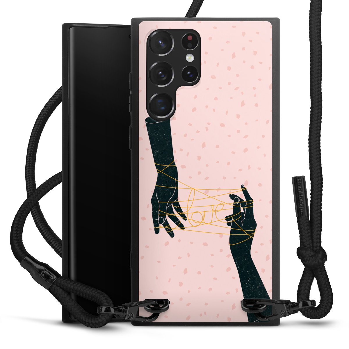 The matt black silicone case is made of flexible TPU (thermoplastic polyurethane) and offers robust protection. The durable, unbreakable material makes the cover flexible and dimensionally stable at the same time. The matte surface makes your design stand out more and is less susceptible to fingerprints and dirt. The stylish trend accessory fits comfortably in the hand and is perfectly complemented by the fabric (polyester) mobile phone strap. The braided fabric strap is approx. 1.70 metres long with a diameter of approx. 0.5 cm. Due to the special knotting technique, the length of the strap can be adjusted by simply pulling it, so that you can adapt it individually to your wishes. The practical case to wear around your neck is available with the fabric strap in black. As a little icing on the cake, we have provided the strap with a chic metal fastener in matt black. The strap is securely fastened to the case with loops made of high-quality genuine leather and press studs. The ends of the fabric strap are covered with metallic end caps and thus protected from fraying.