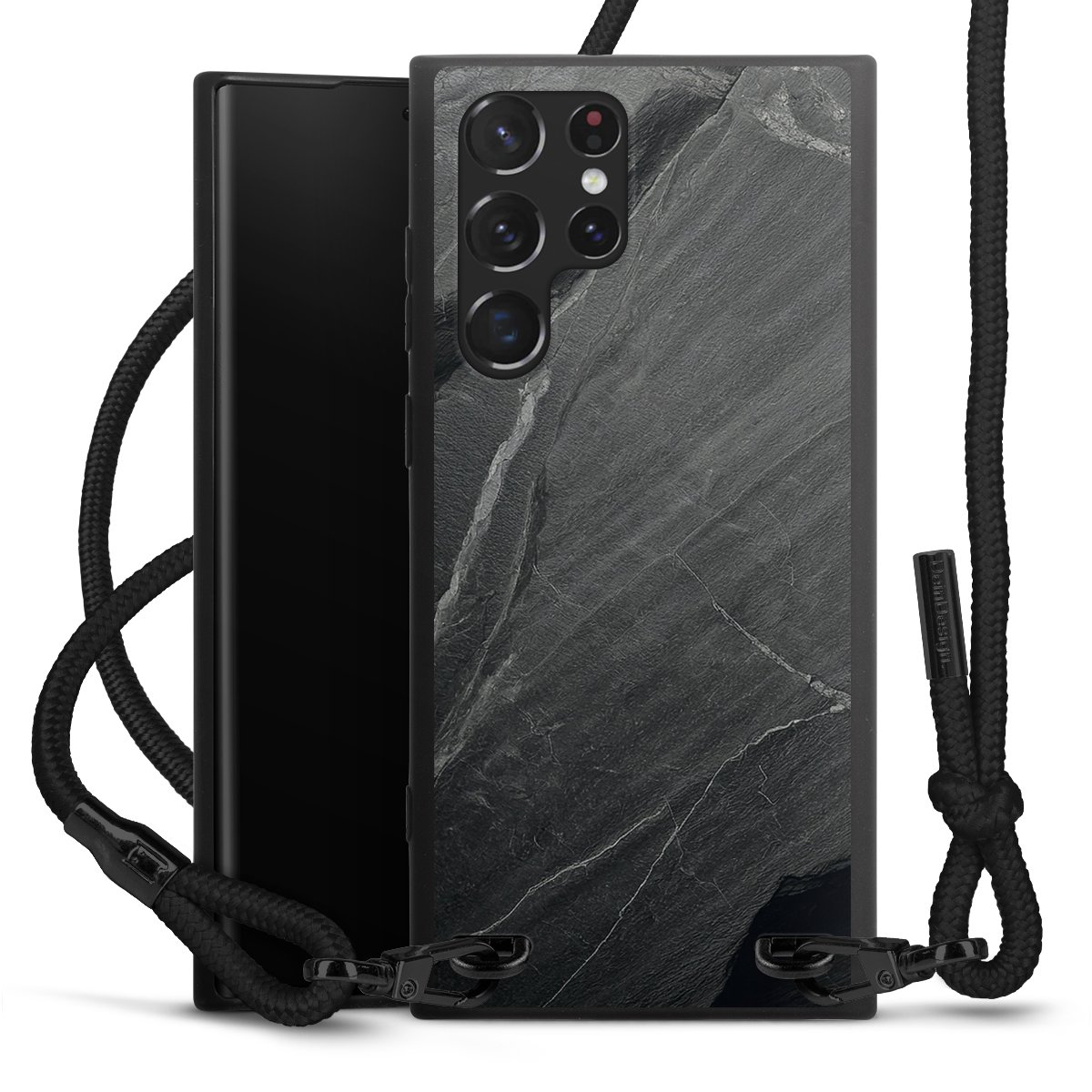 The matt black silicone case is made of flexible TPU (thermoplastic polyurethane) and offers robust protection. The durable, unbreakable material makes the cover flexible and dimensionally stable at the same time. The matte surface makes your design stand out more and is less susceptible to fingerprints and dirt. The stylish trend accessory fits comfortably in the hand and is perfectly complemented by the fabric (polyester) mobile phone strap. The braided fabric strap is approx. 1.70 metres long with a diameter of approx. 0.5 cm. Due to the special knotting technique, the length of the strap can be adjusted by simply pulling it, so that you can adapt it individually to your wishes. The practical case to wear around your neck is available with the fabric strap in black. As a little icing on the cake, we have provided the strap with a chic metal fastener in matt black. The strap is securely fastened to the case with loops made of high-quality genuine leather and press studs. The ends of the fabric strap are covered with metallic end caps and thus protected from fraying.