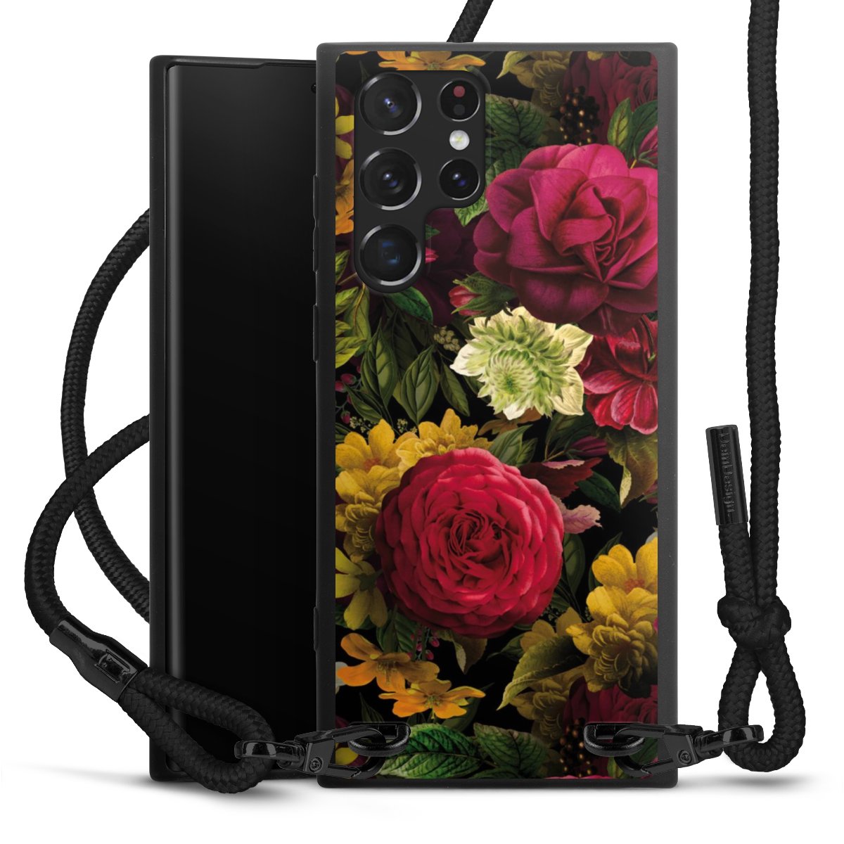 The matt black silicone case is made of flexible TPU (thermoplastic polyurethane) and offers robust protection. The durable, unbreakable material makes the cover flexible and dimensionally stable at the same time. The matte surface makes your design stand out more and is less susceptible to fingerprints and dirt. The stylish trend accessory fits comfortably in the hand and is perfectly complemented by the fabric (polyester) mobile phone strap. The braided fabric strap is approx. 1.70 metres long with a diameter of approx. 0.5 cm. Due to the special knotting technique, the length of the strap can be adjusted by simply pulling it, so that you can adapt it individually to your wishes. The practical case to wear around your neck is available with the fabric strap in black. As a little icing on the cake, we have provided the strap with a chic metal fastener in matt black. The strap is securely fastened to the case with loops made of high-quality genuine leather and press studs. The ends of the fabric strap are covered with metallic end caps and thus protected from fraying.