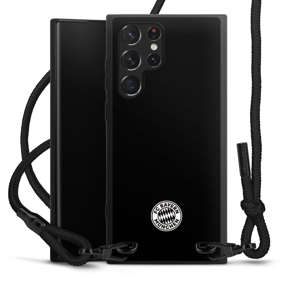 The matt black silicone case is made of flexible TPU (thermoplastic polyurethane) and offers robust protection. The durable, unbreakable material makes the cover flexible and dimensionally stable at the same time. The matte surface makes your design stand out more and is less susceptible to fingerprints and dirt. The stylish trend accessory fits comfortably in the hand and is perfectly complemented by the fabric (polyester) mobile phone strap. The braided fabric strap is approx. 1.70 metres long with a diameter of approx. 0.5 cm. Due to the special knotting technique, the length of the strap can be adjusted by simply pulling it, so that you can adapt it individually to your wishes. The practical case to wear around your neck is available with the fabric strap in black. As a little icing on the cake, we have provided the strap with a chic metal fastener in matt black. The strap is securely fastened to the case with loops made of high-quality genuine leather and press studs. The ends of the fabric strap are covered with metallic end caps and thus protected from fraying.