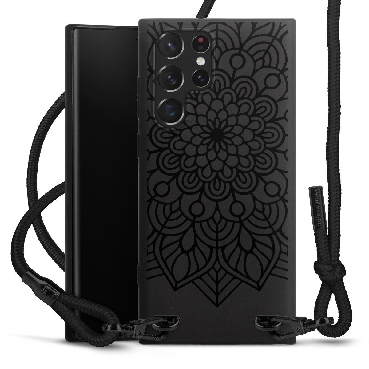 The matt black silicone case is made of flexible TPU (thermoplastic polyurethane) and offers robust protection. The durable, unbreakable material makes the cover flexible and dimensionally stable at the same time. The matte surface makes your design stand out more and is less susceptible to fingerprints and dirt. The stylish trend accessory fits comfortably in the hand and is perfectly complemented by the fabric (polyester) mobile phone strap. The braided fabric strap is approx. 1.70 metres long with a diameter of approx. 0.5 cm. Due to the special knotting technique, the length of the strap can be adjusted by simply pulling it, so that you can adapt it individually to your wishes. The practical case to wear around your neck is available with the fabric strap in black. As a little icing on the cake, we have provided the strap with a chic metal fastener in matt black. The strap is securely fastened to the case with loops made of high-quality genuine leather and press studs. The ends of the fabric strap are covered with metallic end caps and thus protected from fraying.