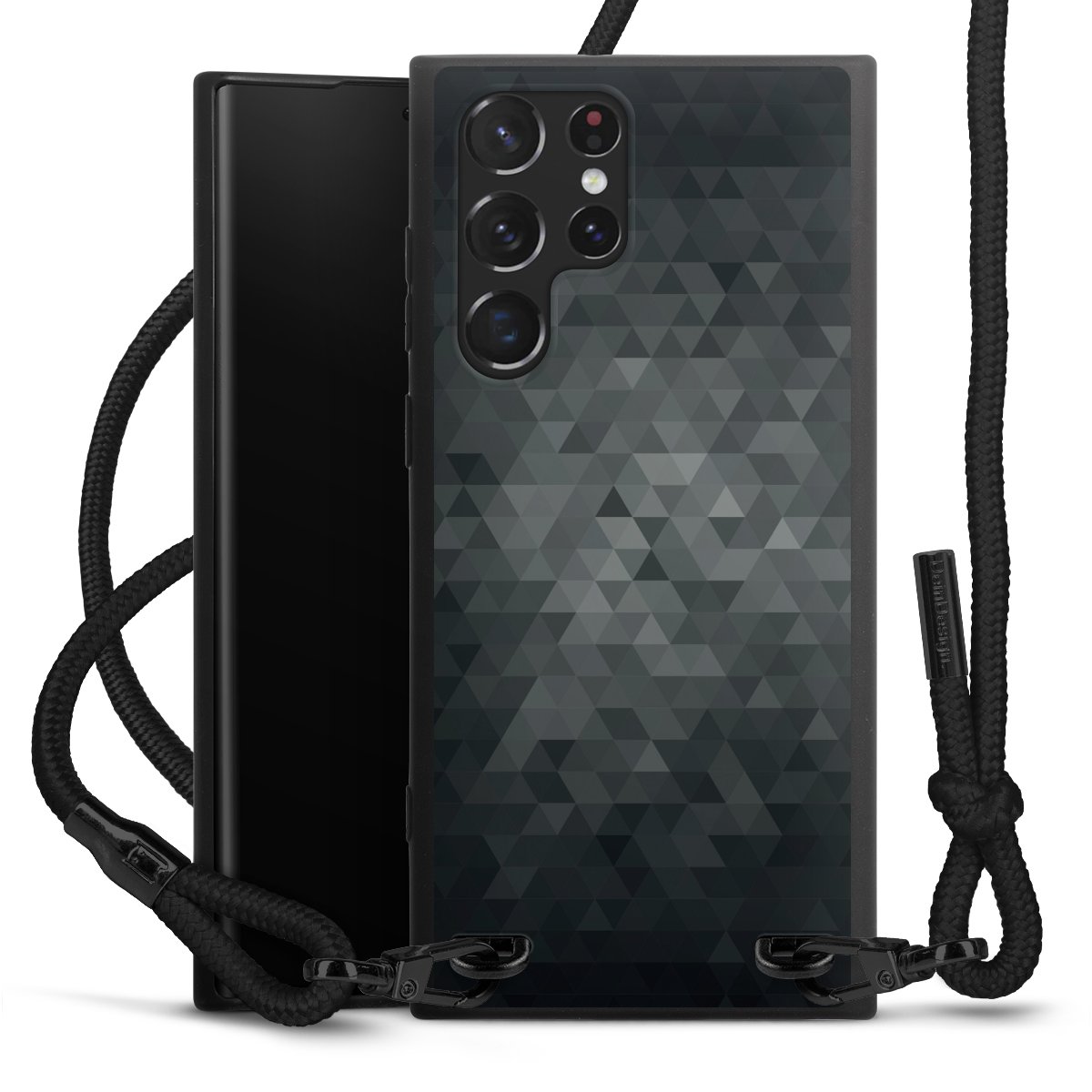 The matt black silicone case is made of flexible TPU (thermoplastic polyurethane) and offers robust protection. The durable, unbreakable material makes the cover flexible and dimensionally stable at the same time. The matte surface makes your design stand out more and is less susceptible to fingerprints and dirt. The stylish trend accessory fits comfortably in the hand and is perfectly complemented by the fabric (polyester) mobile phone strap. The braided fabric strap is approx. 1.70 metres long with a diameter of approx. 0.5 cm. Due to the special knotting technique, the length of the strap can be adjusted by simply pulling it, so that you can adapt it individually to your wishes. The practical case to wear around your neck is available with the fabric strap in black. As a little icing on the cake, we have provided the strap with a chic metal fastener in matt black. The strap is securely fastened to the case with loops made of high-quality genuine leather and press studs. The ends of the fabric strap are covered with metallic end caps and thus protected from fraying.